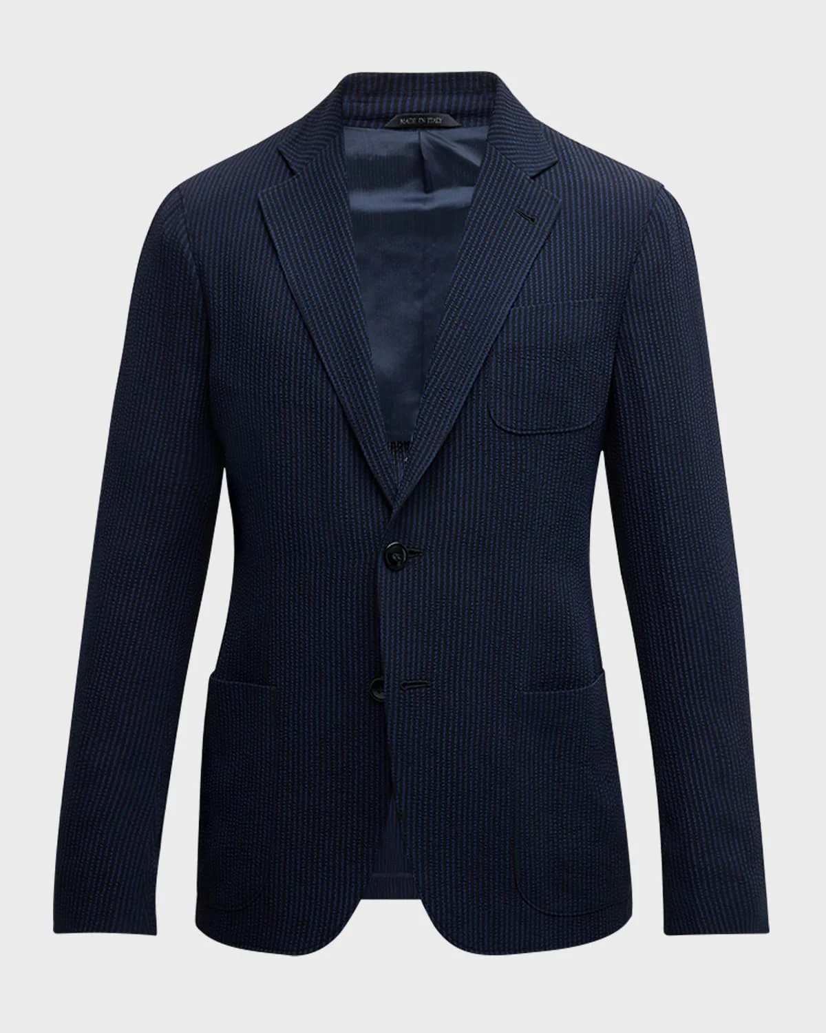 - Giorgio Armani sport coat in striped seersucker - Notched lapels - Two-button closure - Patch pockets - Functional button cuffs - Viscose/acetate - Made in Italy - Model is 6'1"/185cm.