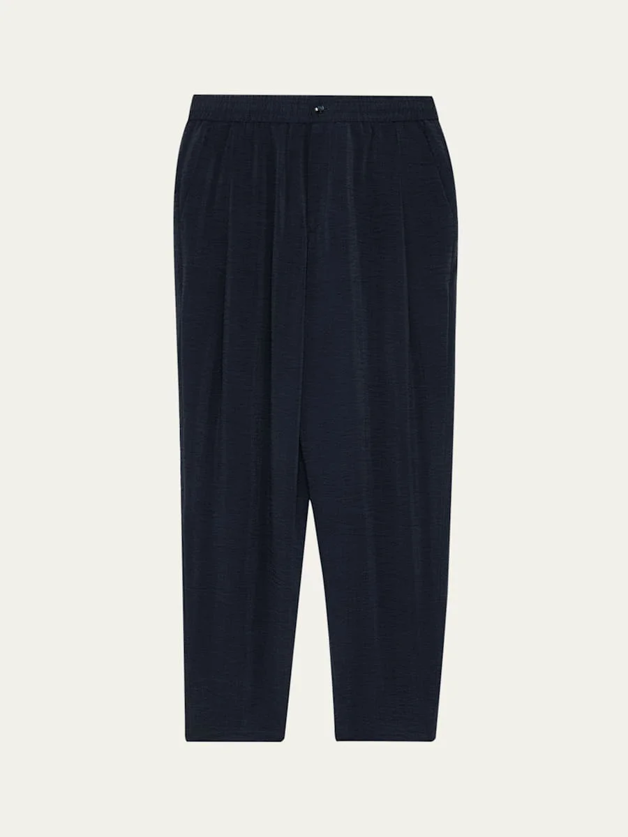 Giorgio Armani trousers detailed with a herringbone texture High rise Side slip pockets Back welt pockets Relaxed legs Full length Elasticized waistband Pullon style Cupro/nylon Dry clean Made in Italy