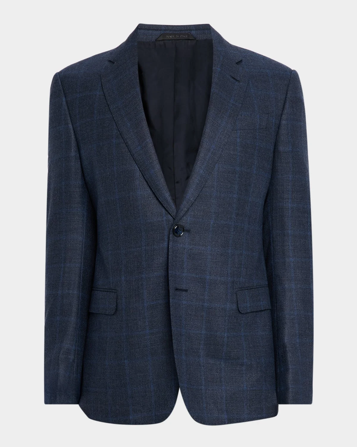 - A subtle grid is woven into this Giorgio Armani superior wool-blend sport coat. - Peak lapels - Two-button front - Chest welt pocket - Interior logo tag and pocket - Side flap pockets - Double-vented back - Virgin wool/viscose - Dry clean - Made in Italy