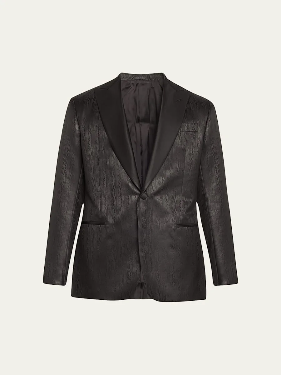 Giorgio Armani dinner jacket in tonal jacquard Peak lapels; singlebutton front Chest welt pocket Jetted hip pockets Unfinished sleeves Doublevented back Virgin wool/silk/polyester Lining: Viscose Dry clean Made in Italy