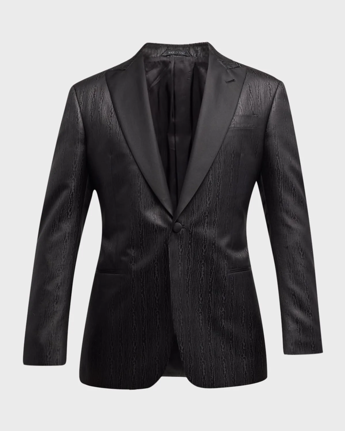 - Giorgio Armani dinner jacket in tonal jacquard - Peak lapels; single-button front - Chest welt pocket - Jetted hip pockets - Unfinished sleeves - Double-vented back - Virgin wool/silk/polyester - Lining: Viscose - Dry clean - Made in Italy - Model is 6'1"/185cm.