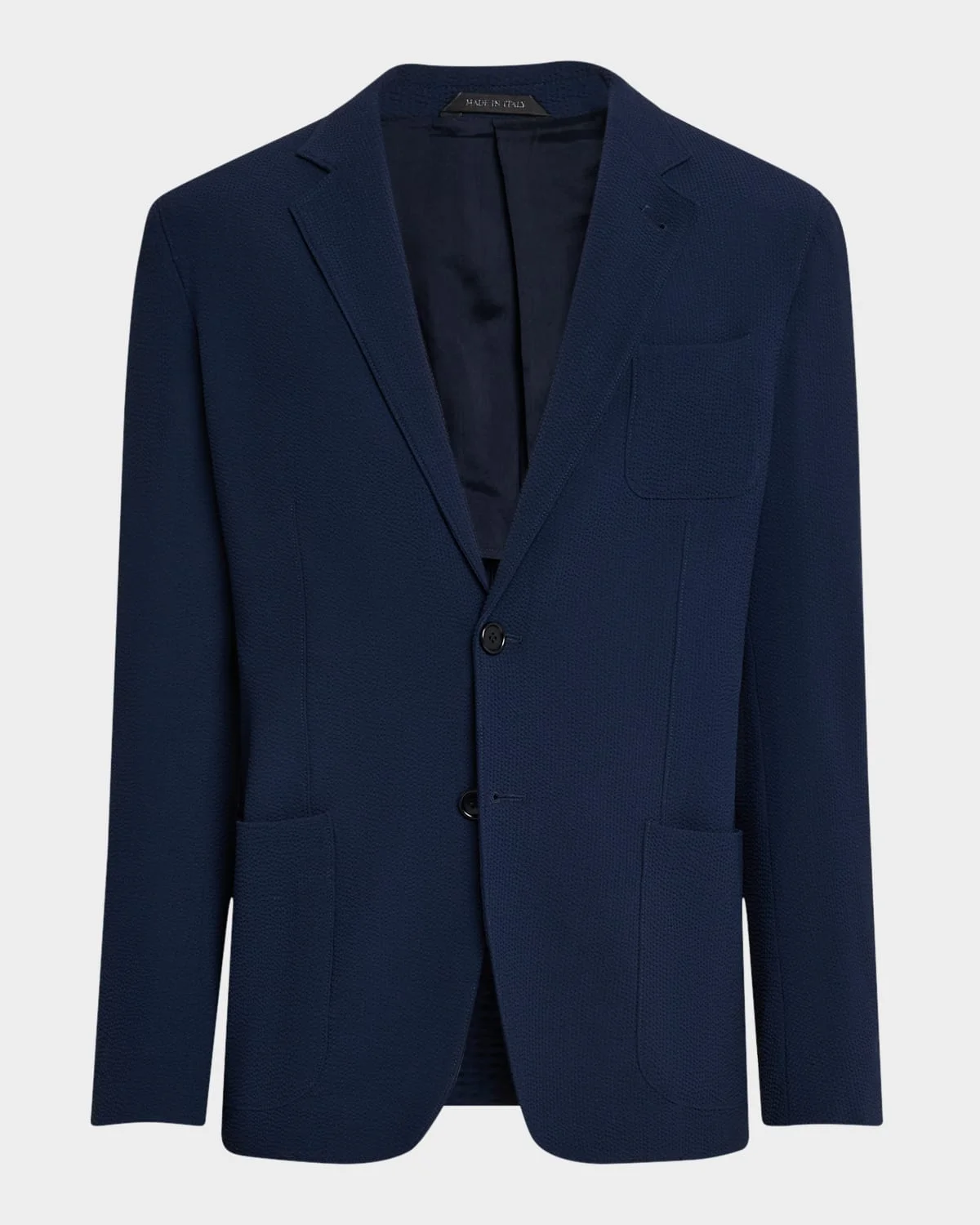 - Giorgio Armani "Upton" sport coat in solid seersucker - Notched lapels - Two-button closure - Chest and hip patch pockets - Four-button sleeve finish - Virgin wool/elastane - Dry clean - Made in Italy