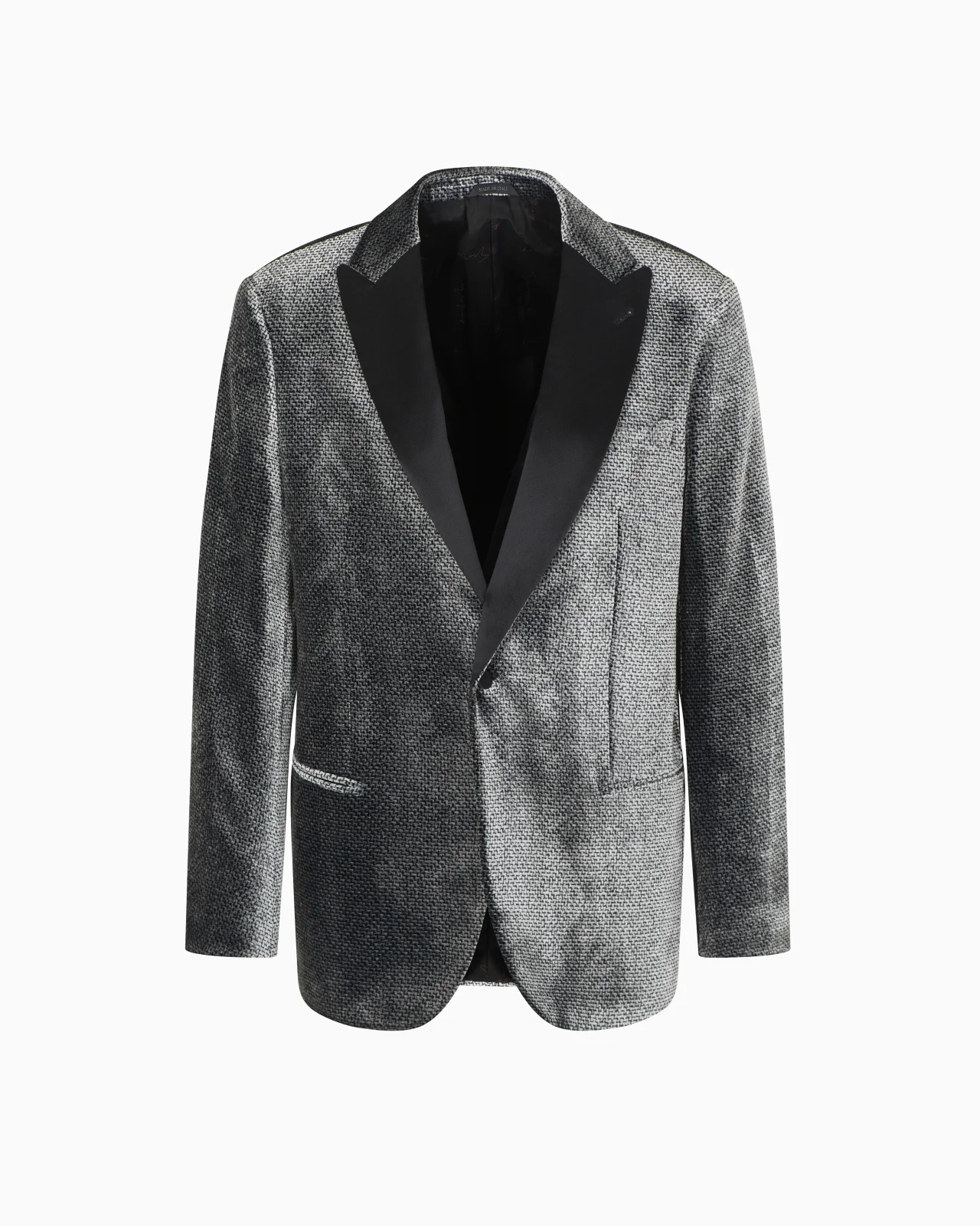 Single-breasted tuxedo jacket made of exquisite devore velvet, with a refined texture that catches the light with delicate chiaroscuro effects, adding depth and uniqueness to the piece. A covered button closure and black satin peak lapels define the silhouette with sophisticated contrast, highlighting the attention to detail that distinguishes the style. A special piece, perfect for those looking for understated yet striking elegance, ideal for special occasions. This style is part of the Giorgio’s collection: the Giorgio Armani selection inspired by the evening world. Clean lines, attention to detail, an elegant night-time colour palette and the choice of luxurious materials define this modern and essential selection, providing the look for an effortless evening wardrobe. Soho line tuxedo jacket Smooth satin collar with peak lapels Single-breasted closure with one smooth satin-covered button Two welt pockets Breast welt pocket Buttons at the sleeve hem Lined Length: 73.5 cm Made in Italy Product Code: GM000491TE17443MC023