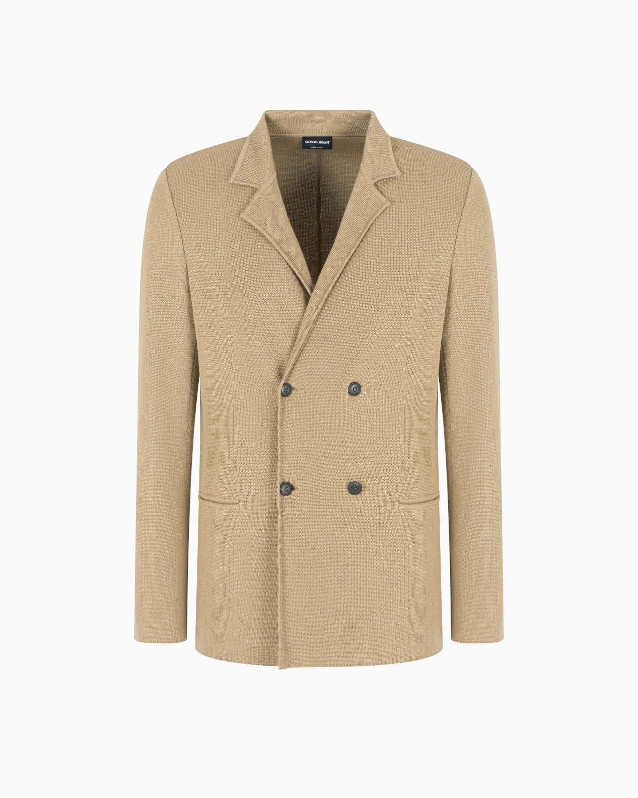 Double-breasted jacket made from a cosy, comfortable virgin wool and cashmere knit. The style’s slinky lines allow the body to move with a non-restrictive fit. It features two front welt pockets and a collar with notched lapels. An offering with a modern, laid-back attitude, perfect to pair with the collection’s shirts for relaxed looks. Fineness: 14 Double-breasted jacket Notched lapels Four-button, double-breasted closure Two welt pockets Unlined Length: 73 cm Made in Italy Product Code: GM001034AF14665U6240