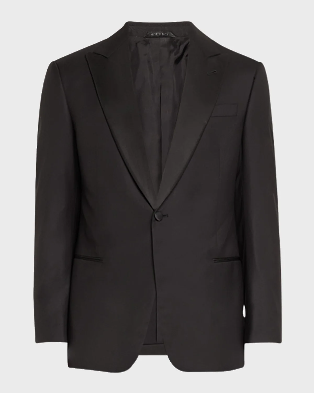 - Giorgio Armani two-piece tuxedo suit in wool - Satin peak lapels - Single-button front - Chest welt pocket - Hip besom pockets - Internal breast pocket - Long basted sleeves - Double-vented back - Flat-front trousers - Unfinished hem to be tailored to desired length - Virgin wool - Made in Italy - Model is 6'1"/185cm.