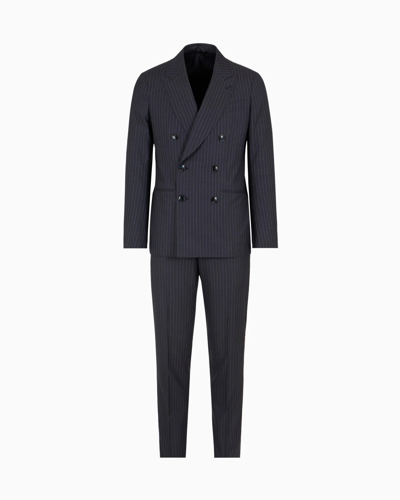 Double-breasted suit from the Napoli Line, made of pinstriped virgin wool featuring an extremely luxurious, highly tailored construction. The suit’s double-breasted, canvassed jacket features internal facing, deconstructed shoulders and a regular fit, while its sleek trousers include a pre-shrunk waistband. This style comes in an intense and elegant dark grey, a hallmark colour of the brand’s iconic style. Napoli Line suit Tailored, canvassed construction with contoured inner facing Two-button, double-breasted, canvassed jacket Deconstructed shoulders Peak lapels Welt pockets Breast welt pocket Side slits Openable cuffs Lined Jacket length: 73 cm Buttoned, zipped trousers Trouser cuff width: 17 cm Made in Italy Product Code: GM000481TE14631MB073