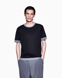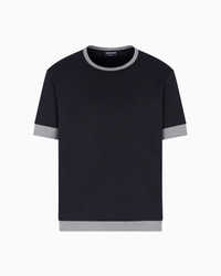 Crew-neck T-shirt made from organic cotton jersey with an extremely soft and comfortable feel. The modern style with a relaxed attitude is finished with contrasting edges. <br>The piece is part of the Holiday selection that plays with a striking colour palette, incorporating black onyx, sky blue and ivory. Such shades are combined with luxurious fabrics like linen and silk, and iconic ones, like cupro and Lyocell, creating a unique experience in texture. Modern, relaxed shapes dress up different occasions with unmistakable Giorgio Armani style. Crew neck Short sleeves Contrasting collar, armholes and hem Made in Italy Product Code: GM001948TE10333UC001