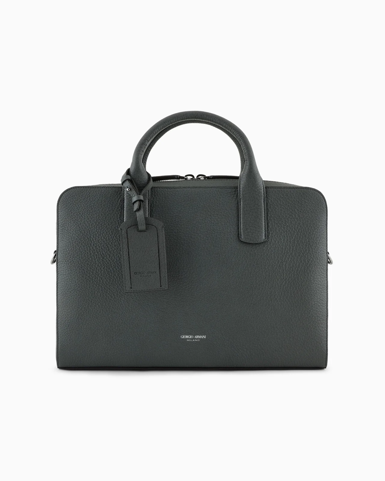 Elegant briefcase made of pinpoint embossed calfskin. The style has a covered tubular double handle, double-slider zip fastening and a convenient adjustable, detachable shoulder strap, allowing it to be carried in two ways. The interior is lined with cotton drill and features a laptop compartment, interior pocket and cardholder patch pocket. Double tubular leather handle Oversized double-slider zip closure Zipped inner pocket Cotton drill lining Padded laptop compartment Cardholder patch pocket Heat-stamped Giorgio Armani logo Adjustable, detachable leather shoulder strap Measurements: 39 x 28 x 5 cm Made in Italy Product Code: Y2P275YR56JU8066