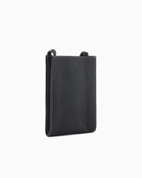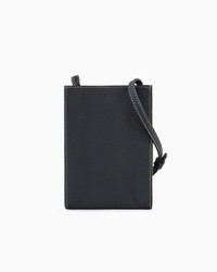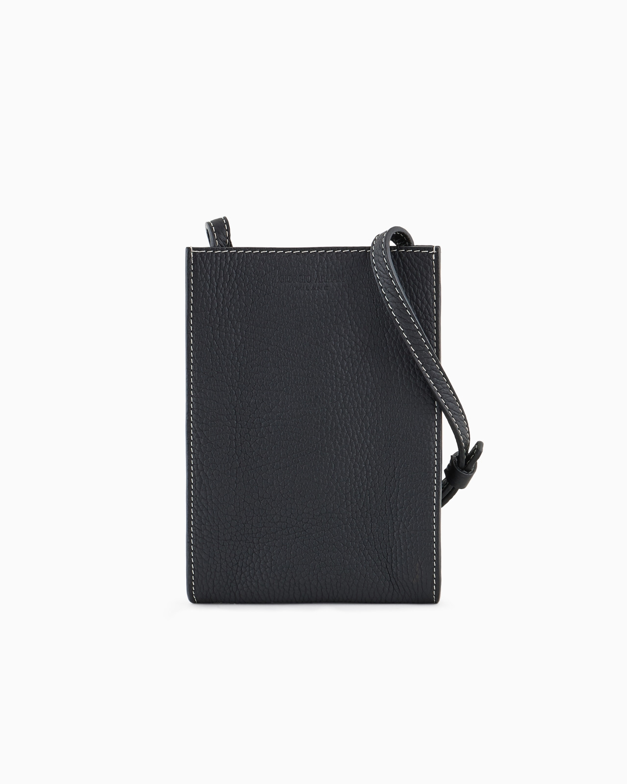 Mobile phone holder made of pebbled leather, featuring a clean and essential design, embellished with contrasting stitching and a heat-stamped Giorgio Armani logo. The practical adjustable shoulder strap allows for crossbody wear, perfect for everyday use. Suede lining Adjustable shoulder strap Contrasting topstitching Heat-stamped Giorgio Armani logo Measurements: 14 x 5 x 19 cm Made in Italy Product Code: GM001217AF14825UC001