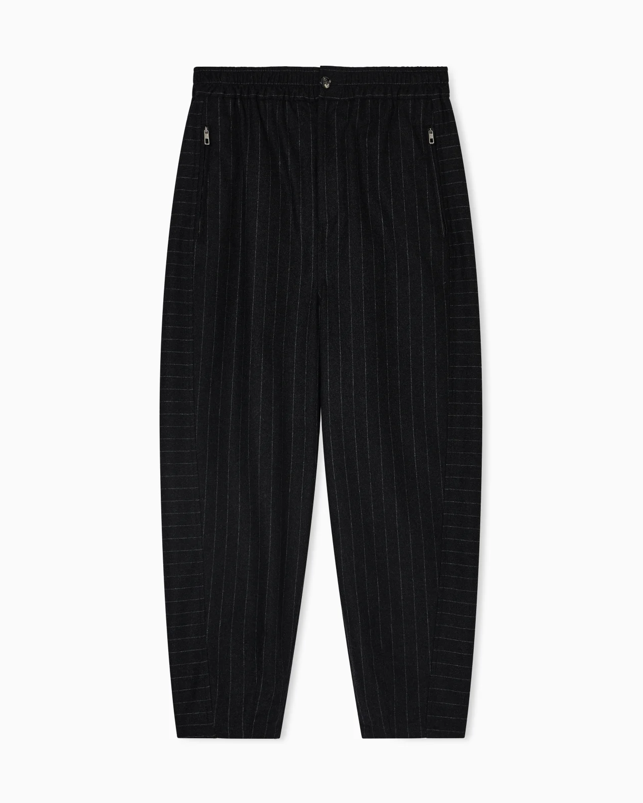 Flat-front trousers made of cosy cashmere, embellished with a pinstriped motif. With an elasticated waistband, button and zip closure and two side zip pockets, this style lends itself to numerous combinations with jackets and jumpers from the collection for effortless, relaxed looks. Flat-front trousers Elasticated waistband Button and zip closure Two zipped side pockets Back zipped pocket Cuff width: 18 cm Made in Italy Product Code: GM002282TE17628O8007
