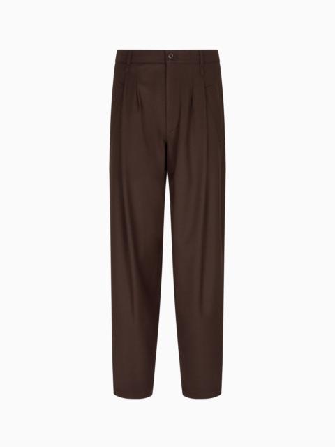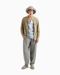 Single-pleat trousers made of viscose and linen canvas, with comfortable, relaxed volumes. With a single front pleat adding movement, the piece has two slant pockets, welt back pockets and a matching stitching detail at the ankle cuffs. A modern, versatile offering, designed to dress up daytime looks in a relaxed way, teamed with the collection’s trousers and jumpers. Single-pleat trousers Waistband with belt loops Button and zip closure Two slant pockets Two buttoned back pockets Leg hem detail with matching stitching Cuff width: 18 cm Made in Italy Product Code: GM001421TE10088U8066