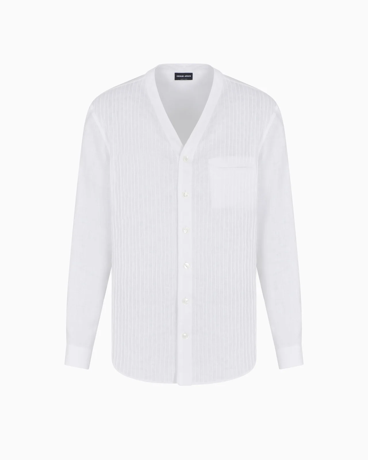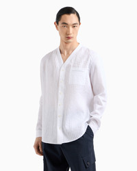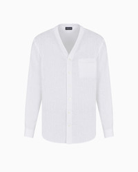 Sophisticated regular-fit shirt made of linen and available in the collection colour palette. Featuring a V-neckline and mother-of-pearl button closure, this style is distinguished by sophisticated tailoring that recreates a rib motif on the front of the garment. An elegant piece that is perfect for embellishing numerous looks. Regular fit V neck Fastened with visible mother-of-pearl buttons Double-welt breast pocket Tailored by hand with front rib motif Back yoke Cuffs with mother-of-pearl buttons Made in Italy Product Code: GM001404TE11049U0002