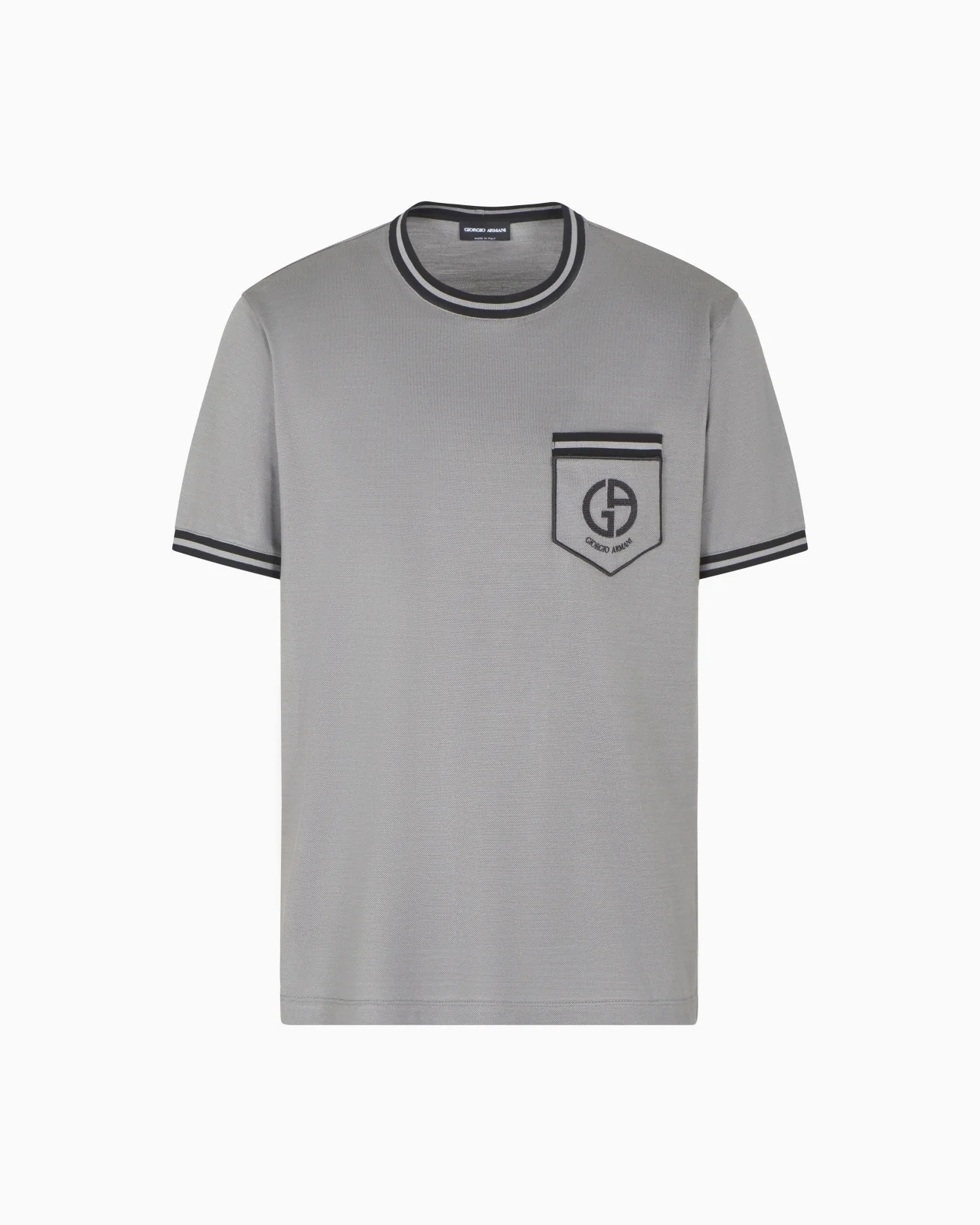 Short-sleeved T-shirt made from pure silk pique jersey that feels soft and is extremely comfortable to wear. The modern style with a relaxed allure features a round collar and is customised with a contrasting embroidered GA logo on the small pocket and details finished with a contrasting viscose trim. <br>The piece is part of the Holiday selection that plays with a striking colour palette, incorporating black onyx, sky blue and ivory. These shades are combined with luxurious fabrics like linen and silk, and iconic ones, like cupro and Lyocell, creating a unique experience in texture. Modern, relaxed shapes dress up different occasions with unmistakable Giorgio Armani style. Crew neck Short sleeves Breast patch pocket with contrasting, embroidered GA logo Contrasting viscose details on collar, armholes and pocket Made in Italy Product Code: GM001939TE15967U8162