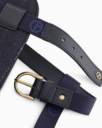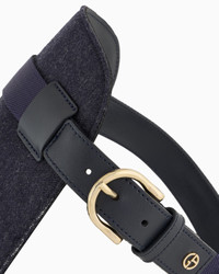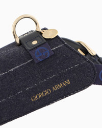 Elegant blue leather harness with pinstriped virgin wool inserts, minimalist lines, lit up by the gold-coloured accents of the snap hooks, which allow the leash to be securely gripped, customised by the heat-stamped Giorgio Armani logo. An alternative to the collar, it wraps around the torso creating a sense of safety and comfort during walks. This accessory is part of the Poldo x Giorgio Armani collection, the first capsule collection entirely dedicated to our four-legged friends, combining the brand’s unmistakable style with functional fabrics and designs. A selection full of must-have accessories designed to pamper pets during moments of relaxation and accompany them on strolls and trips to discover the city. Gold-coloured metal double snap hook Adjustable with gold-coloured metal buckles Size Reference: Size S: 20.8 x 45 x 42 cm Size M: 23 x 48 x 45 cm Made in Italy Product Code: GX000008AF13987UB081