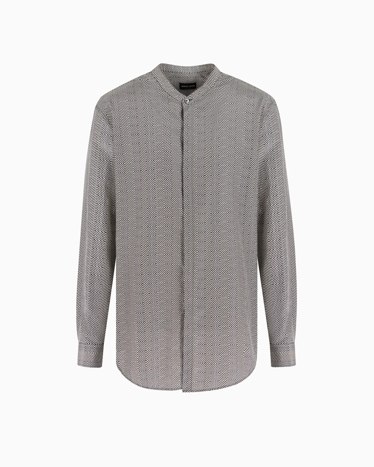 Regular-fit shirt made of silk and cotton and embellished with a contrasting chevron print. This garment features an iconic guru collar, mother-of-pearl buttons and a back yoke. A refined item that complements many looks. Regular fit Guru collar Front fastening with mother-of-pearl effect buttons Button cuffs Back yoke Made in Italy Product Code: GM001584TE14686MC023