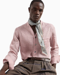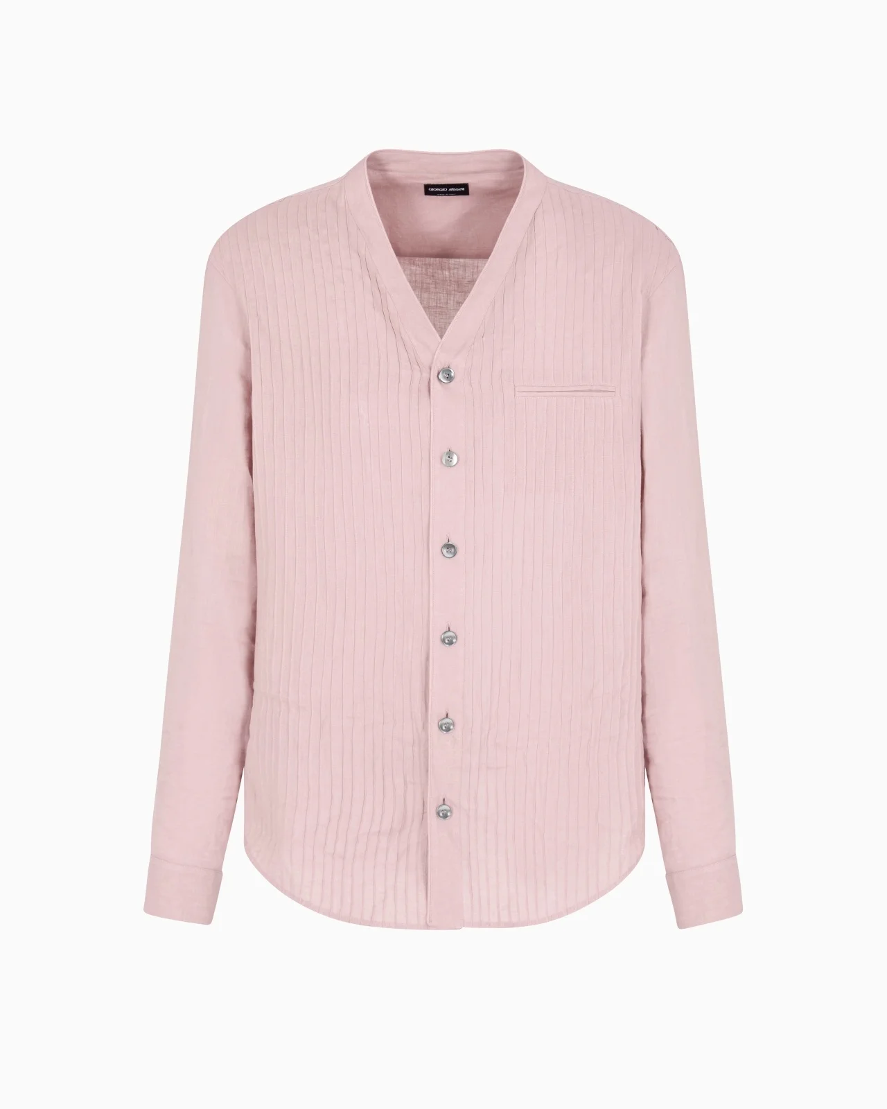 Sophisticated regular-fit shirt made of linen and available in the collection colour palette. Featuring a V-neckline and mother-of-pearl button closure, this style is distinguished by sophisticated tailoring that recreates a rib motif on the front of the garment. An elegant piece that is perfect for embellishing numerous looks. Regular fit V neck Fastened with visible mother-of-pearl buttons Double-welt breast pocket Tailored by hand with front rib motif Back yoke Cuffs with mother-of-pearl buttons Made in Italy Product Code: GM001404TE11049U4224