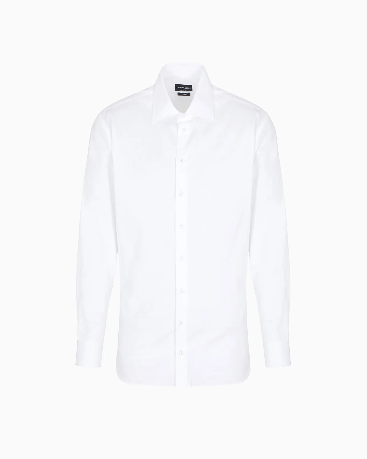 Regular-fit shirt made of solid-colour luxury cotton. Regular-fit style featuring classic French collar with stays, back yoke, French seams with a gusset and mother-of-pearl buttons. Product Code: 8WGCCZMRTZ0691U0BN Details Composition 100% Cotton Regular fit French collar with collar stays Mother-of-pearl button closure Back yoke French seams Side hem with gusset Inner collar stays Buttoned cuffs with a sleeve placket Made in Italy Fitting The model is 188 cm tall and is wearing size 40