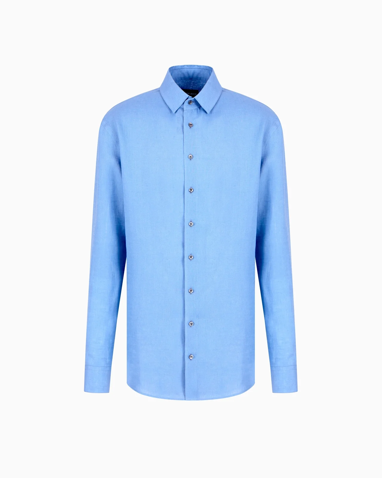 Regular-fit linen shirt with a light, fresh feel. The style features a small collar with customised stays, a back yoke, French seams and mother-of-pearl buttons. Regular fit Shirt with small pointed collar with metal stays Long sleeves Mother-of-pearl logo button closure Back yoke Made in Italy Product Code: 8WGCCZ98TZC62U9296