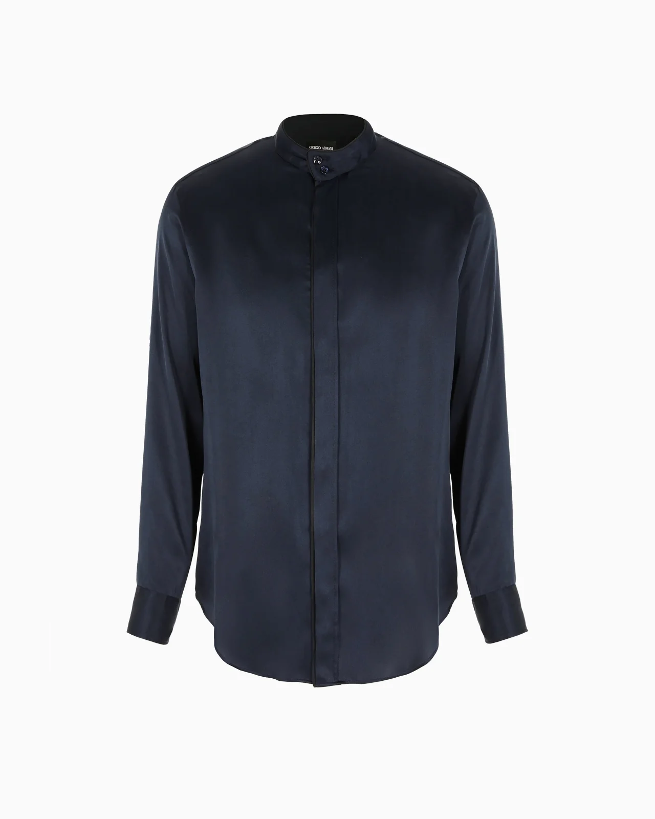 Regular-fit shirt made of exquisite silk with a hint of stretch, offered in the collection’s deep colours. The style is defined by its guru collar, back yoke and concealed placket fastening with mother-of-pearl buttons. A elegant piece, ideal for completing evening looks. Product Code: 3WGCC08HT04ND1UBWF Details Composition 94% Silk 6% Elastane Regular fit Guru collar Back yoke Back darts Fastened with mother-of-pearl buttons French seams Made in Italy Fitting The model is 188 cm tall and is wearing size 40 Italian Size
