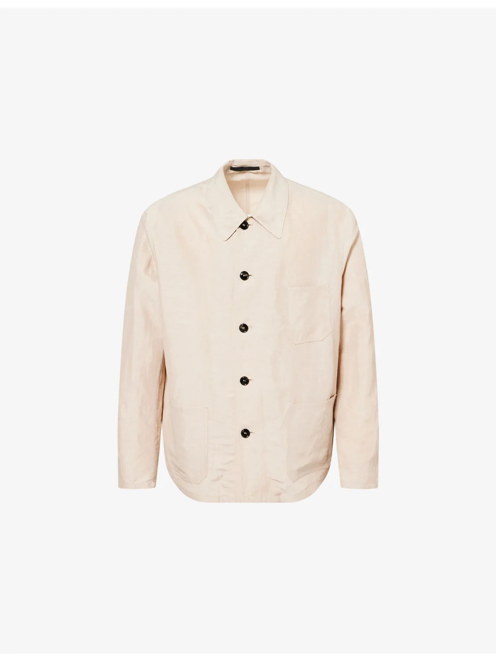 PRODUCT DETAILS - Giorgio Armani woven jacket - 63% viscose, 37% linen - Exposed button fastening at front - Relaxed fit, spread-collar, long sleeves, three patch pockets at front - Dry clean - Made in Italy - Size UK 40: length 28in / 72cm, chest 52in / 133cm - Model is 6ft 2in/1.88m and wears a size UK 40 - Lightweight, stretchy Ref: R04545257