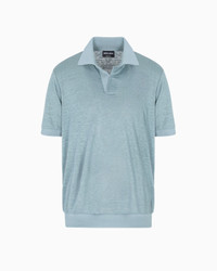 Short-sleeved polo shirt with a modern, laid-back attitude, made from linen jersey with a comfortable, lightweight feel. The clean, streamlined design features a buttonless open collar, and is finished with a matching-tone viscose-knit trim. A piece designed to complete informal looks when worn with the collection’s trousers and bermuda shorts. <br>The piece is part of the Holiday selection that plays with a striking colour palette, incorporating black onyx, sky blue and ivory. Such shades are combined with luxurious fabrics like linen and silk, and iconic ones, like cupro and Lyocell, creating a unique experience in texture. Modern, relaxed shapes dress up different occasions with unmistakable Giorgio Armani style. Open polo-shirt collar Short sleeves Matching viscose-knit collar, cuffs and hem Made in Italy Product Code: GM001996TE11335U9228