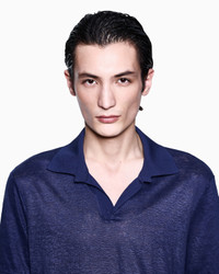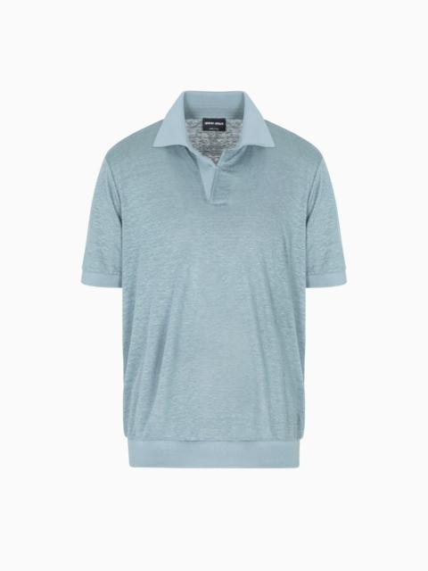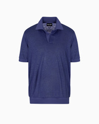 Short-sleeved polo shirt with a modern, laid-back attitude, made from linen jersey with a comfortable, lightweight feel. The clean, streamlined design features a buttonless open collar, and is finished with a matching-tone viscose-knit trim. A piece designed to complete informal looks when worn with the collection’s trousers and bermuda shorts. <br>The piece is part of the Holiday selection that plays with a striking colour palette, incorporating black onyx, sky blue and ivory. Such shades are combined with luxurious fabrics like linen and silk, and iconic ones, like cupro and Lyocell, creating a unique experience in texture. Modern, relaxed shapes dress up different occasions with unmistakable Giorgio Armani style. Open polo-shirt collar Short sleeves Matching viscose-knit collar, cuffs and hem Made in Italy Product Code: GM001996TE11335UB092