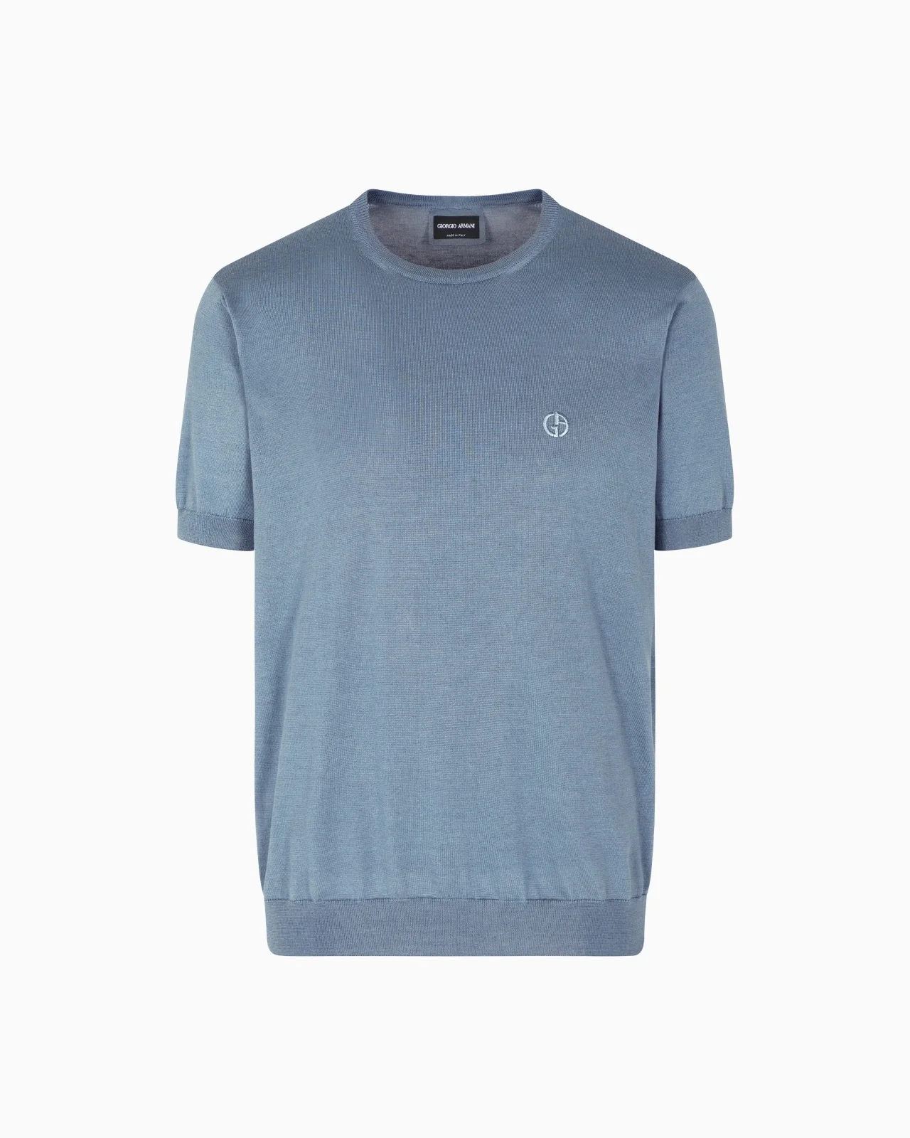 Crew-neck jumper made from silk and cotton with a soft, comfortable feel, available in the collection’s hallmark colour palette. A clean, streamlined style, finished with ribbed edges and customised with a matching-tone embroidered GA logo on the chest.<br>The piece is part of the Holiday selection that plays with a striking colour palette, incorporating black onyx, sky blue and ivory. Such shades are combined with luxurious fabrics like linen and silk, and iconic ones, like cupro and Lyocell, creating a unique experience in texture. Modern, relaxed shapes dress up different occasions with unmistakable Giorgio Armani style. Fineness: 18 Crew neck Short sleeves Customised with matching embroidered GA logo on the chest Made in Italy Product Code: GM001726AF17856U9228