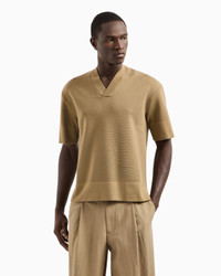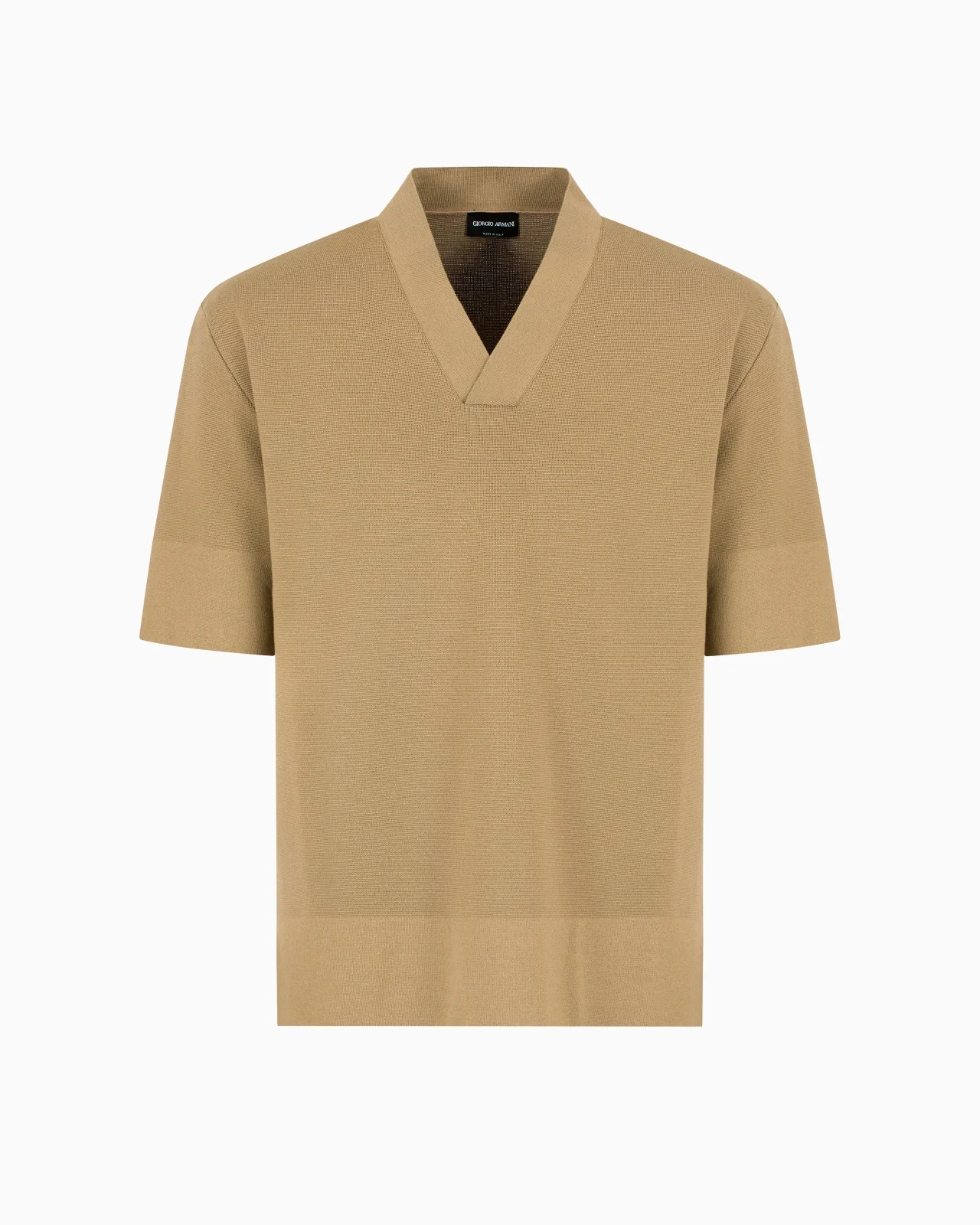 Short-sleeved jumper in cosy fabric-stitched virgin wool. The style is ultra-fine and cosy to ensure a comfortable fit and features a V neck with a slight overlap. A piece that combines the effortless style of a T-shirt with the sophistication of a polo shirt, creating an adaptable offering with a fresh and versatile attitude. Fineness: 18 V-neck with small overlap Short sleeves Side slits Made in Italy Product Code: GM001030AF14662U6240