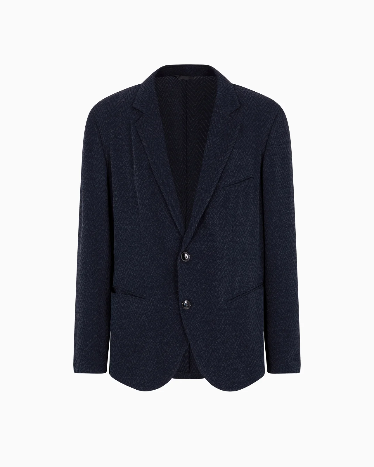 Single-breasted jacket in cupro and viscose, made of responsible forestry fibres, with a special chevron jacquard that gives the fabric a three-dimensional effect. Featuring a lightweight construction and completely unlined, it has notched lapels, two welt pockets, buttoned cuffs and a welt pocket on the chest. It can be worn with the collection’s trousers to create a modern business suit with a relaxed feel. Single-breasted jacket Notched lapels Two-buttoned, single-breasted closure Breast welt pocket Two small welt pockets Buttons at the sleeve hem Unlined Length: 72 cm Made in Italy Product Code: GM001564TE14380UB114