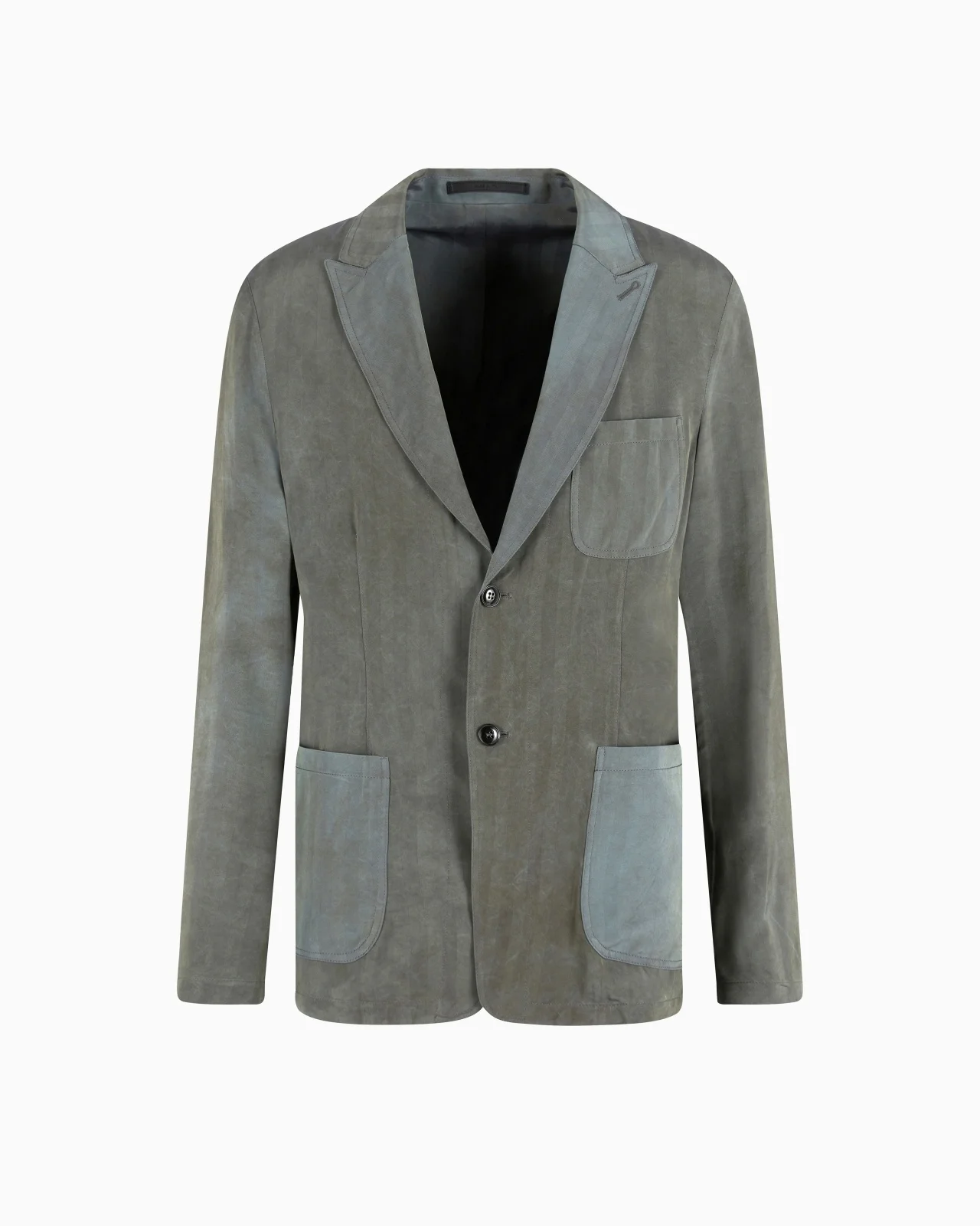 Single-breasted jacket made of viscose canvas with a distinctive iridescent finish, accentuating the brightness of the yarn. Featuring peak lapels and patch pockets, the style has a relaxed, fresh attitude, offering a new vision of a jacket that is more versatile and laid back, perfect for informal looks. Single-breasted jacket Peak lapels One front patch pocket Two front patch pockets Two-buttoned, single-breasted closure Four-button cuffs Unlined Inner pocket Made in Italy Product Code: GM001407TE14298F7074