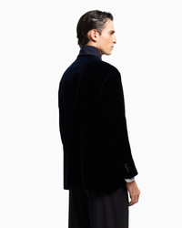 Single-breasted jacket with elongated lines, made of premium velvet from the collection, embellished with a contrasting knit insert that customises the neckline and placket. The style features a five-button closure and small welt pockets, one at the chest and two at the sides, and is distinguished by its clean yet sophisticated silhouette. An offering with an elegant, modern style, designed for eveningwear looks. Single-breasted jacket in velvet Slightly stand collar with V neckline Contrasting knit insert at the collar and placket Five-button, single-breasted closure Breast welt pocket Two small welt pockets Buttoned cuffs Lined Length: 78 cm Made in Italy Product Code: GM002544TE10046UB109
