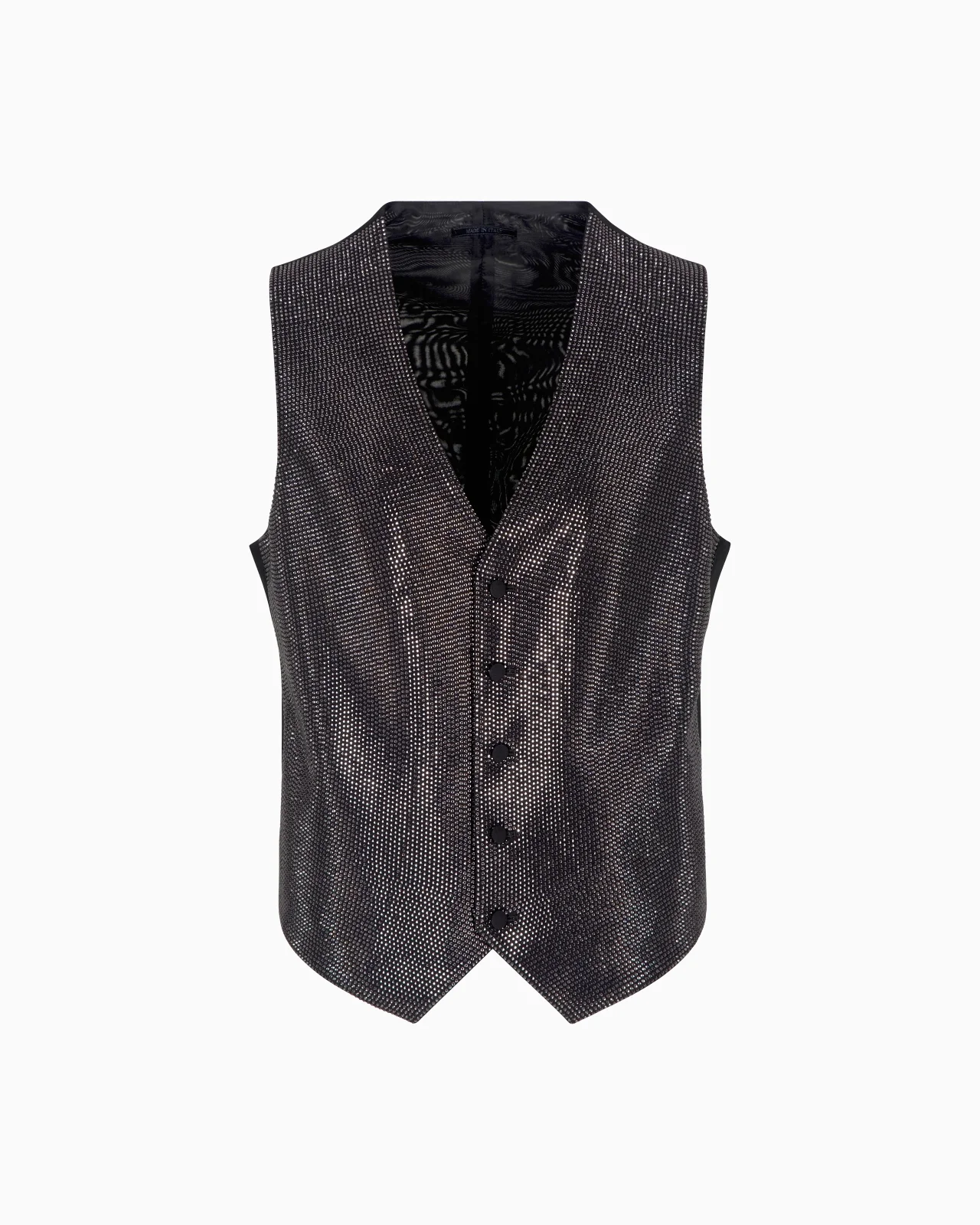 Luxurious and bright single-breasted waistcoat made of a viscose blend, with a shiny feel, made special by the front application of monochromatic all-over rhinestones. A dramatic piece, designed to complete the most formal evening looks with a sophisticated touch.<br>The piece is part of the exclusive collection that celebrates the connection between Giorgio Armani and the world of Hollywood. A colour palette of deep blues combines with a profound and ever-elegant black, to create a sparkling, luxurious selection inspired by the limelight and most exclusive Hollywood parties. Extremely sophisticated pieces with iconic lines are made of velvets, silks and satins enlivened by crystal and rhinestone embellishments and refined workmanship. Looks for him and her, designed for evenings and special occasions. V neck Front part covered all-over in matching rhinestones Single-breasted closure with five covered buttons Adjustable back with strap Lined Length: 56.5 cm Made in Italy Product Code: GM001733AF17872MC023
