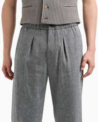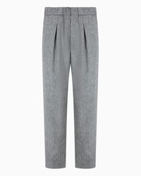 Trousers made of linen and virgin wool, with a denim effect. With a single front pleat, side welt pockets and a button-and-zip fastening, the style stands out for its relaxed, fresh attitude: Perfect for pairing with the collection's shirts and T-shirts in an endless variety of looks. Single-pleat trousers Elasticated waist Button and zip closure Two side welt pockets Two back pockets Cuff width: 19 cm Made in Italy Product Code: GM000576TE14457U8085