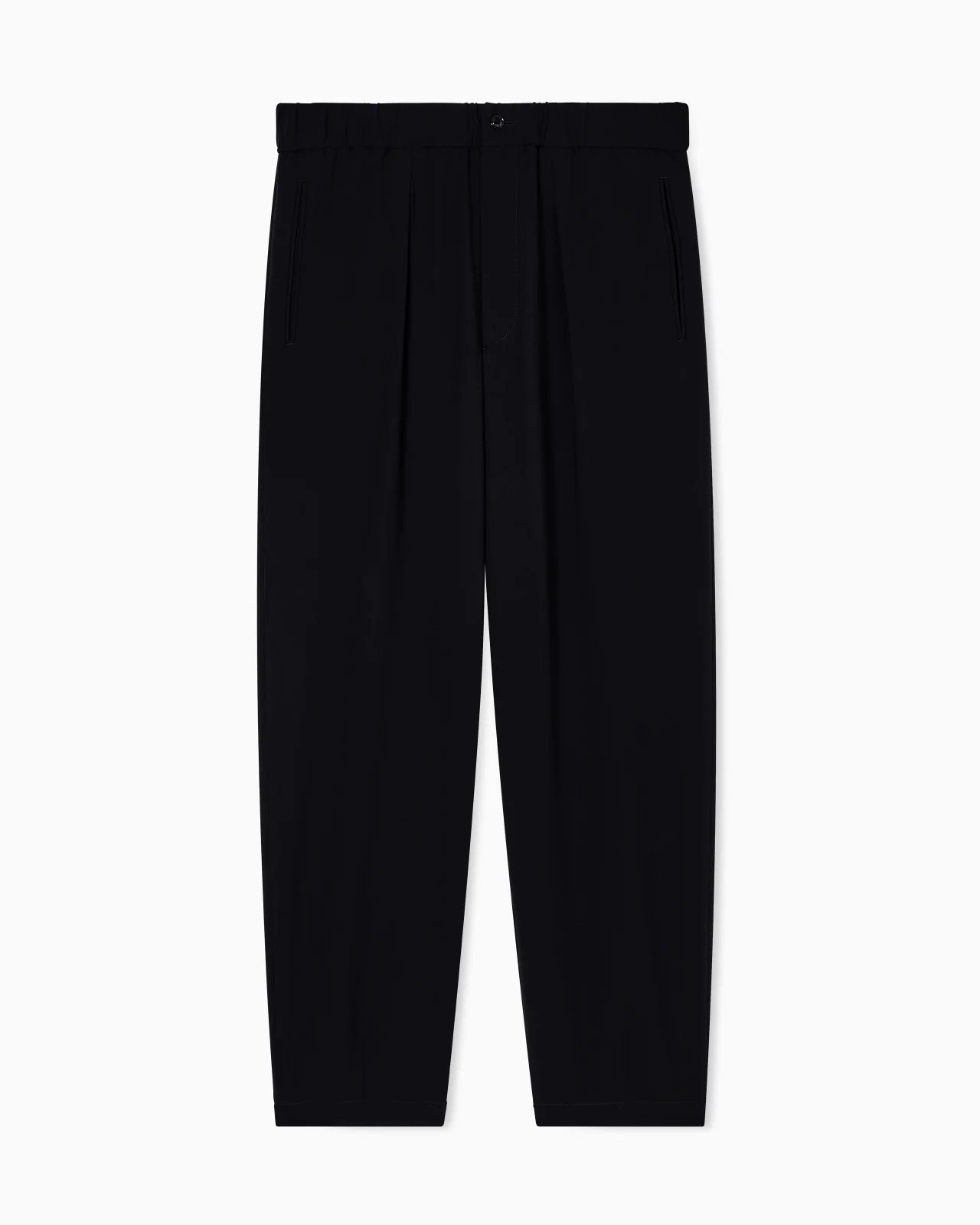 Pure virgin-wool crepe trousers. With a single front pleat, side welt pockets and a button-and-zip fastening, the style stands out for its relaxed, laid-back attitude: perfect for pairing with the collection’s shirts and jumpers in an endless variety of looks. Single-pleat trousers Elasticated waistband Button and zip closure Two side welt pockets Two back welt pockets Cuff width: 19 cm Made in Italy Product Code: GM000576TE10043UC001