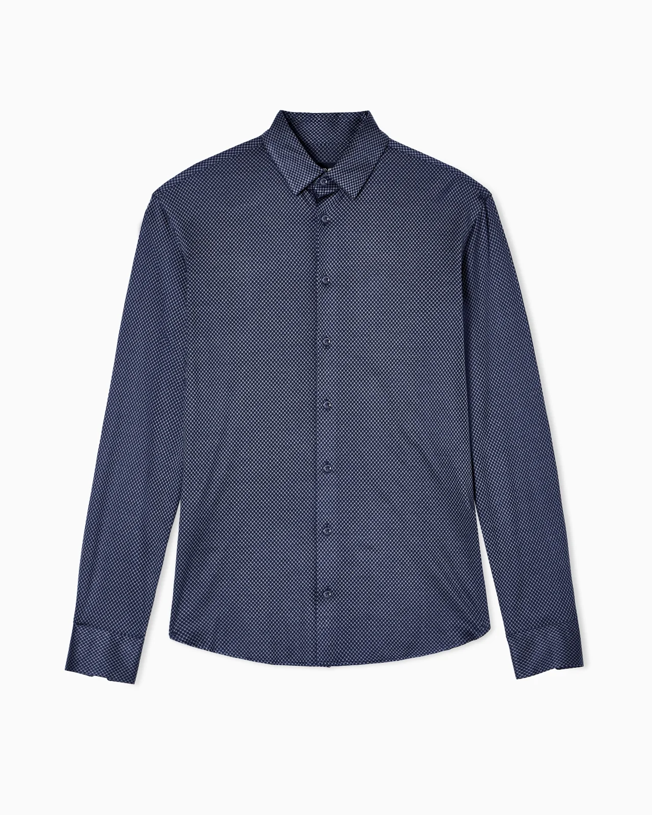 Shirt made of silk and cotton jersey, embellished with micro jacquard. It is defined by a slim fit, back darts, mother-of-pearl buttons and a small collar leaf with metal stays, making it perfect with formal attire. Shirt with small pointed collar with metal stays Long sleeves Mother-of-pearl logo button closure Back darts Back yoke Made in Italy Product Code: GM000056TE17686MB031