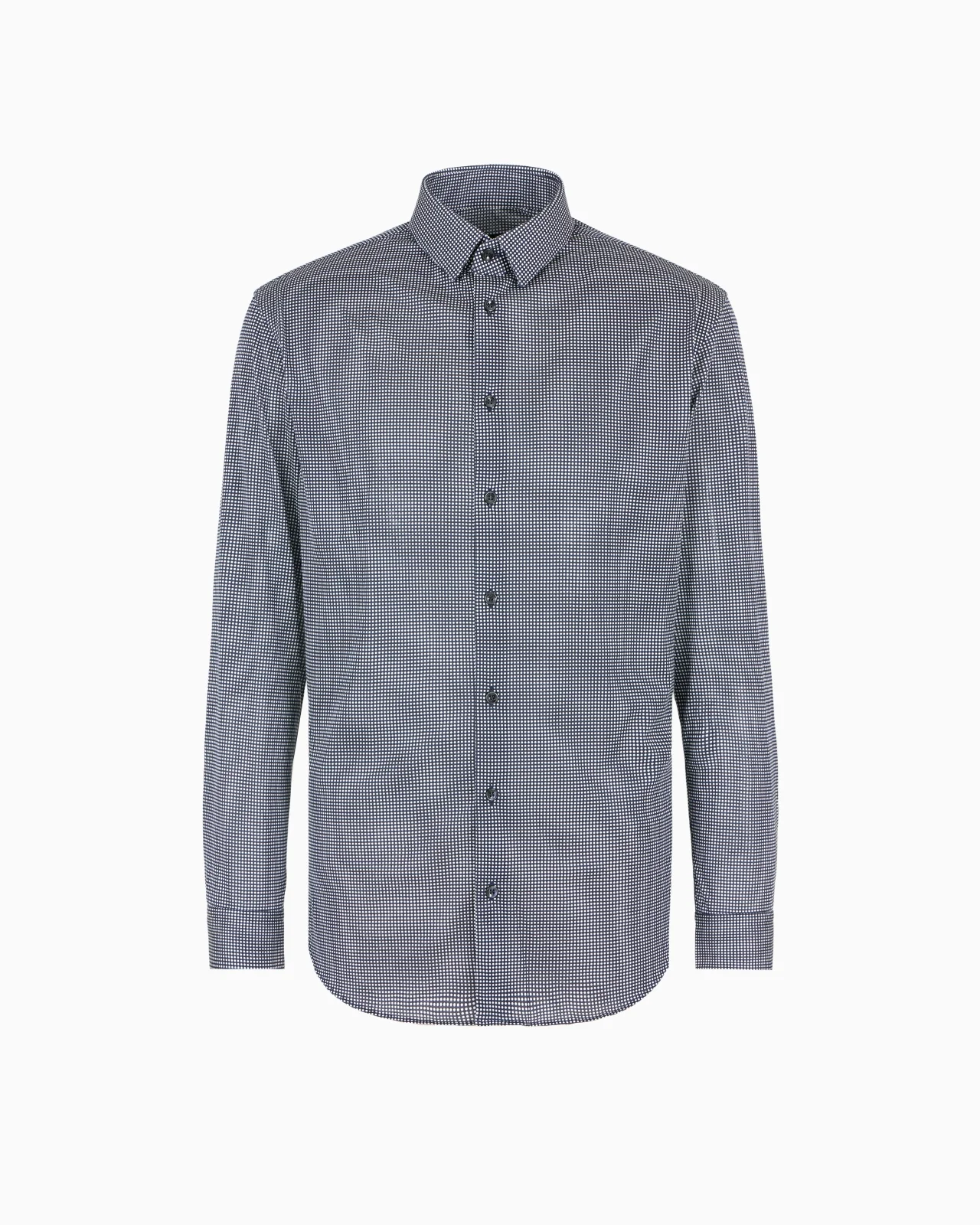 Slim-fit, cotton-jersey shirt with a collar with small leaves, fastening with visible mother-of-pearl buttons, cuffs with sleeve placket and French seams. Embellished with a micro polka dot print, this style is perfect for completing various looks and matching with the collection's trousers and jackets. Slim fit Shirt with small pointed collar with metal stays Mother-of-pearl button closure Cuffs with button and sleeve placket French seams Back darts Back yoke Made in Italy Product Code: GM000056TE14555MB024