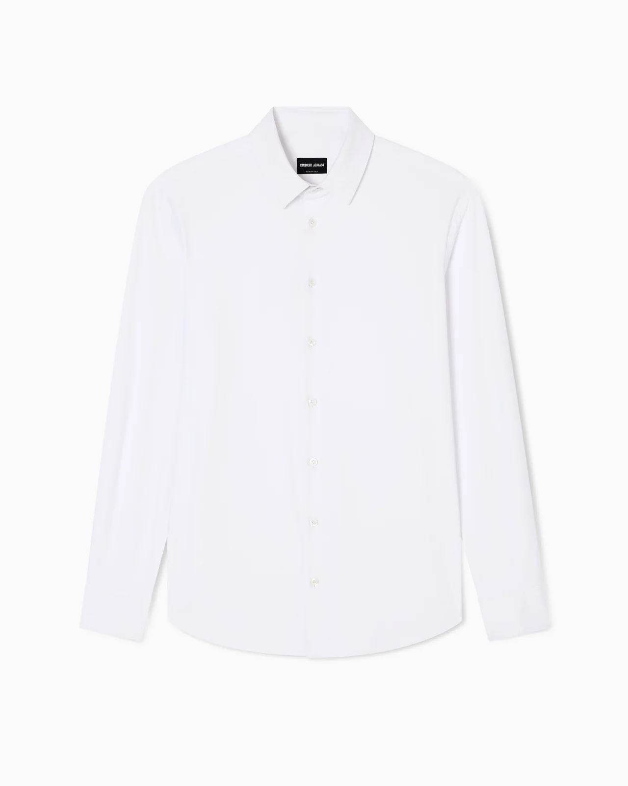 Shirt made of micro-textured jersey, in brilliant white. It is defined by a slim fit, back darts, mother-of-pearl buttons and a small collar leaf with metal stays, making it perfect with formal attire. Shirt with small pointed collar with metal stays Long sleeves Mother-of-pearl logo button closure Back darts Back yoke Made in Italy Product Code: GM000056TE17688U0002