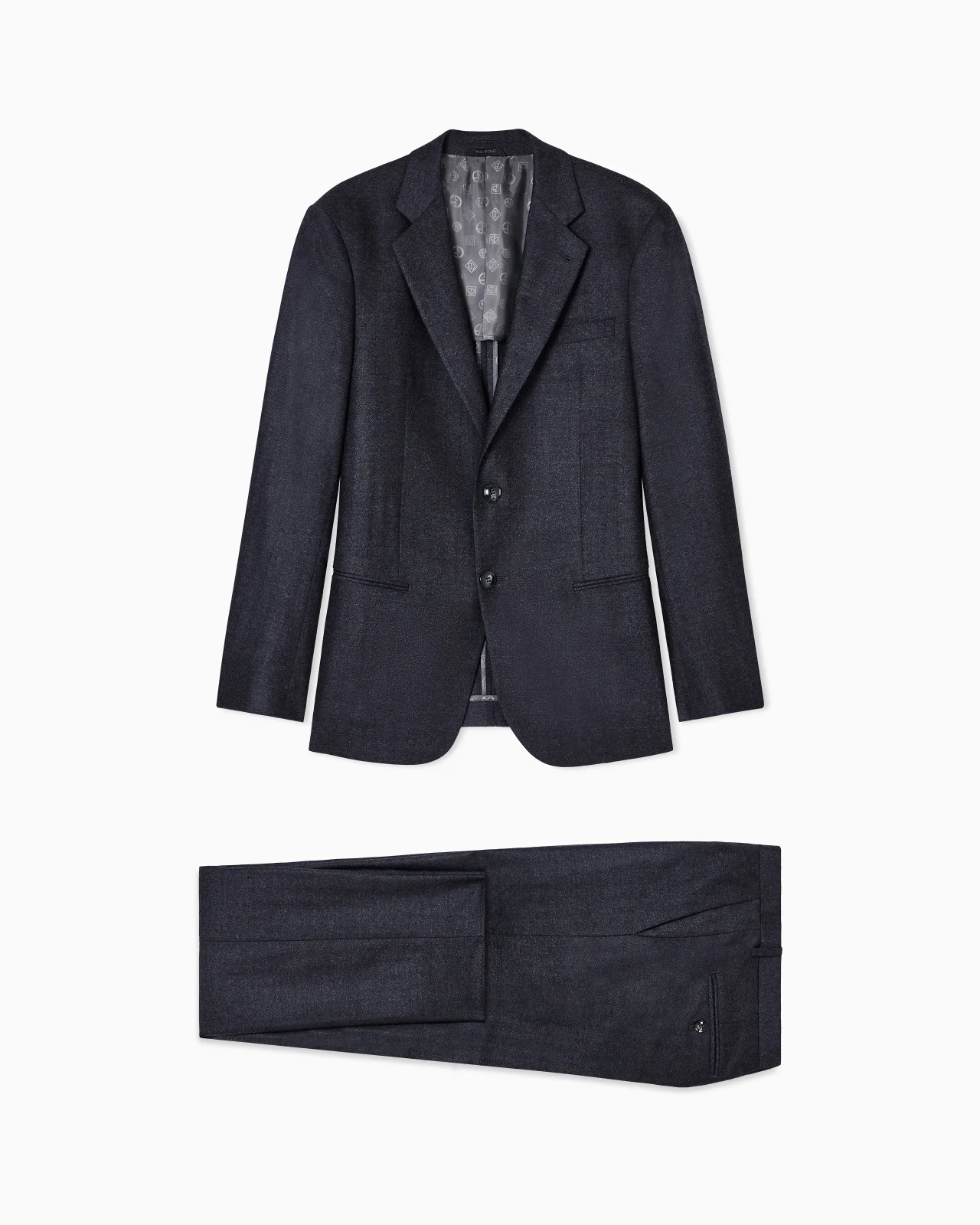 This sophisticated Soho line suit combines tailoring traditions with luxurious, refined fabrics that highlight the garment’s modern image. This style, in virgin wool and cashmere, animated by an iconic chevron motif, is composed of a single-breasted jacket with notched lapels and welt pockets, paired with flat-front trousers in a comfortable fit. A timeless style, indispensable to the elegant man’s wardrobe. Soho Line suit Single-breasted jacket with two buttons Notched lapels Two welt pockets Breast welt pocket Side slits Unlined Jacket length: 73.5 cm Flat-front trousers Waistband with belt loops Button and zip closure Two welt pockets Two back welt pockets Trouser hem width: 19 cm Made in Italy Product Code: GM000606TE11812MC023