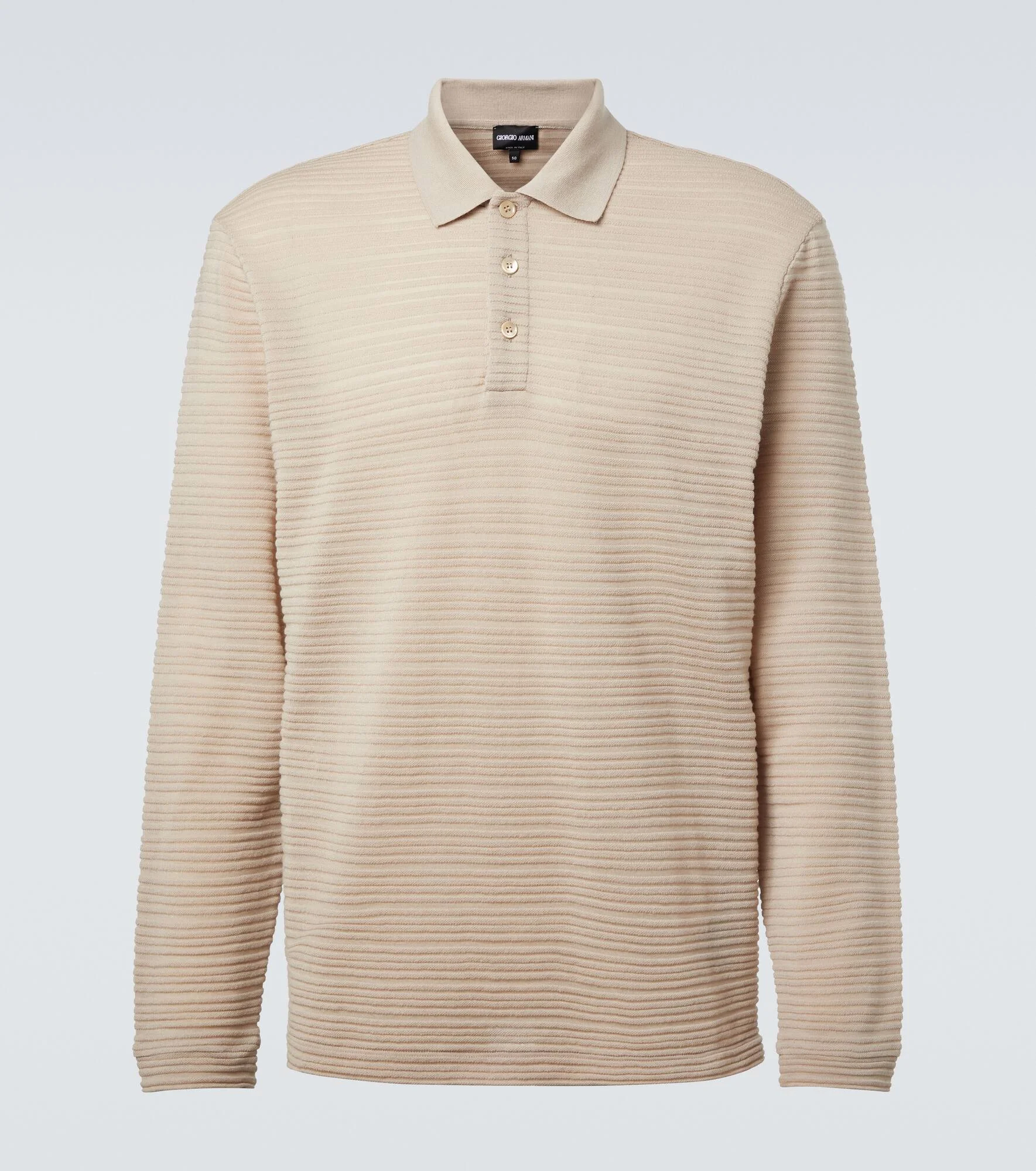 Known for its streamlined modernity, Giorgio Armani presents an elegant take on classic silhouettes and immaculate suiting. This polo sweater is crafted from virgin wool jersey and showcases a raised striped motif. Product Details - Material: 100% virgin wool - Care instructions: dry clean - Made in Italy - Designer color name: Sample Sand - Item color: beige - Details: 81% wool, 13% polyamide, 6% elastane - Contains non-textile parts of animal origin - Collar: polo collar - Closure: partially buttoned front - Item number: P01047856 Size & Fit - True to size - Designed for a loose fit - Slightly stretchy fabric - Falls below the hip - Height of model is 192cm-75.5" and wears a size IT 50