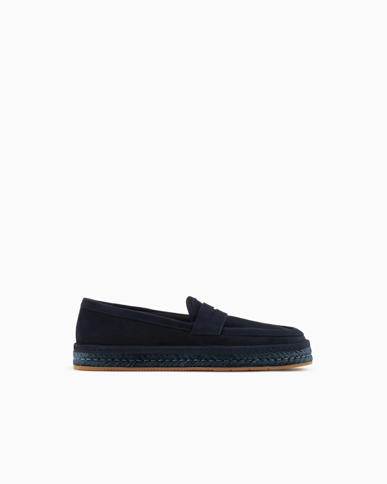 Distinctive, sophisticated loafers made of supple suede, embellished with a rope-covered sole, similar to espadrilles. The style is defined by its clean, lightweight lines and comfortable fit, making it ideal for summer. An elegant offering, but with a casual-chic attitude, in tune with the Armani aesthetic. Suede upper Rope-covered EVA sole Suede-covered welt TPU sole Made in Italy Product Code: X2A408XF68600006
