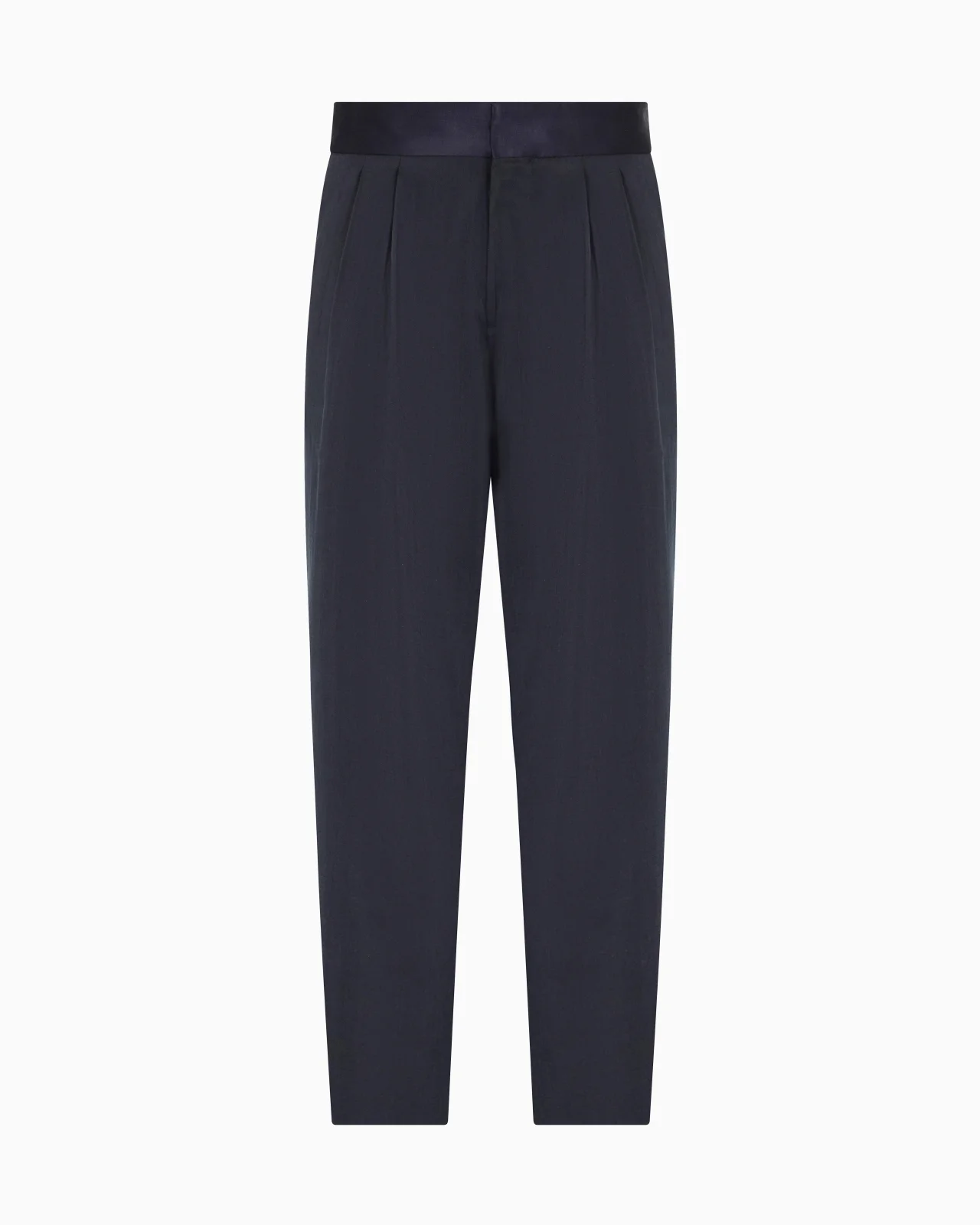 Two-pleat trousers made from a washed silk blend in a comfortable fit. The style features a smooth waistband, a concealed hook and zip fastening and side pockets. An iconic piece, embellished with matching satin inserts, perfect for special occasions. Double-pleat trousers Smooth satin waistband Zip-and-hook closure Two side welt pockets Two buttoned back welt pockets Cuff width: 19.5 cm Made in Italy Product Code: GM001567TE10081U8134