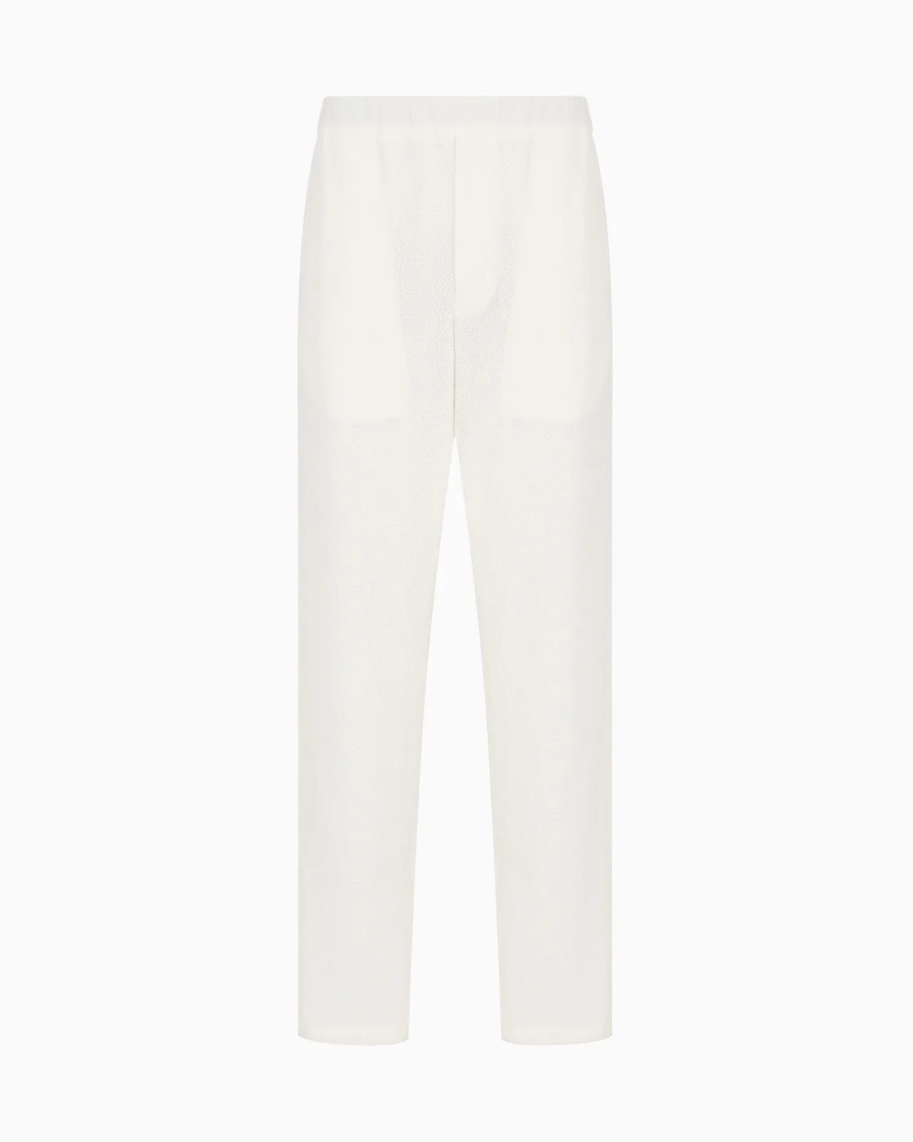 These casual men’s trousers are defined by a fluid cut, unrestricted fit, cosy fabric and laid-back allure. This flat-front style with elasticated waistband and comfortable fit is made from technical waffle and can be styled to create a wide variety of daytime outfits. Product Code: GM000060TE100451U0006 Details Composition 80% Polyamide 20% Elastane Flat-front style Elasticated waist Zip closure Two side pockets One back pocket with press-stud closure Cuff width: 18 cm Made in Italy Fitting The model is 188 cm tall and is wearing size 48/M