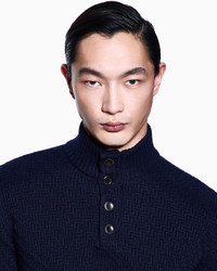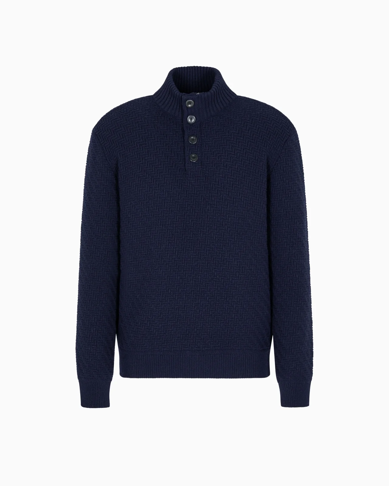A distinctive mock neck jumper made from warm, cosy cashmere, featuring a diagonal links stitch that adds a three-dimensional effect and structure. An offering defined by the three-quarter button closure and rib-knit edges, designed to complete casual looks with a relaxed allure. Fineness: 7 Rib-knit mock neck Three-quarter fastening with four exposed buttons Long sleeves Rib-knit cuffs and hem Chevron diagonal links stitch Made in Italy Product Code: GM001961AF19073UB101