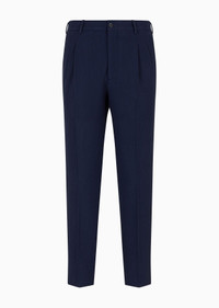 Darted trousers in stretch virgin wool, made from natural fibres from responsible farming, with a seersucker motif that gives structure to the piece. They feature a waistband with a zip and button closure, side inseam pockets and double-welt back pockets. This garment’s flowing deconstructed style reflects the Giorgio Armani aesthetic. Product Code: 8WGPP03DT051M1UBWF Details Composition 99% Virgin Wool 1% Elastane The fabric is made of 99% wool from responsible farming Double pleats Button and zip closure Side slant pockets Buttoned back welt pocket Cuff width: 17 cm Made in Italy Fitting The model is 188 cm tall and is wearing size 48/M