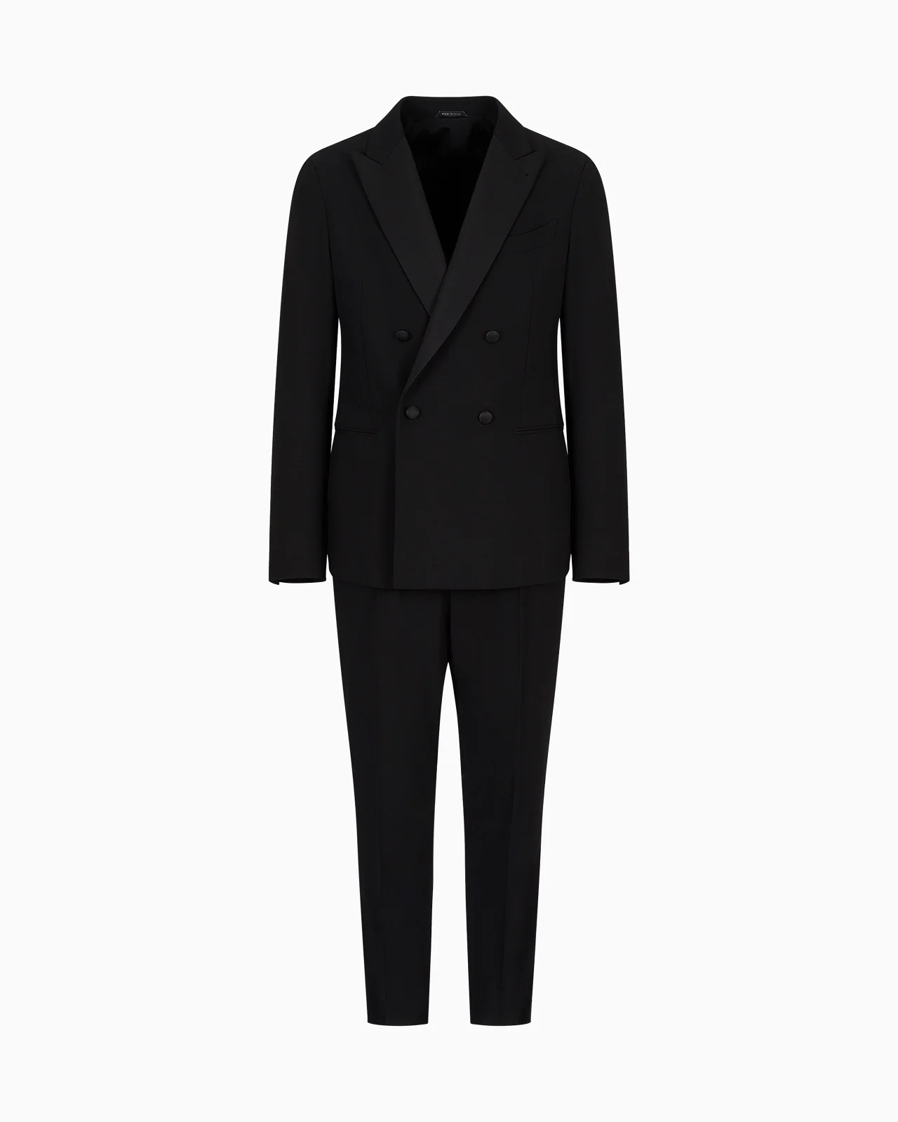 The ultimate symbol of elegance, the tuxedo is a must-have of the refined men’s wardrobe. Made from soft virgin wool crepe, this double-breasted style is defined by a comfortable fit, while the peak lapels and trouser stripes are enhanced with monochromatic grosgrain details. An iconic style, perfect for special occasions. Product Code: 1SGAS015T002Z1UC99 Details Composition 100% Virgin Wool Upton Line double-breasted tuxedo Deconstructed jacket with double-breasted closure, peak lapels, flap pockets and welt pocket Single-darted trousers Jacket length: 71 cm Trouser cuff width: 17 cm Monochromatic grosgrain details Made in Italy