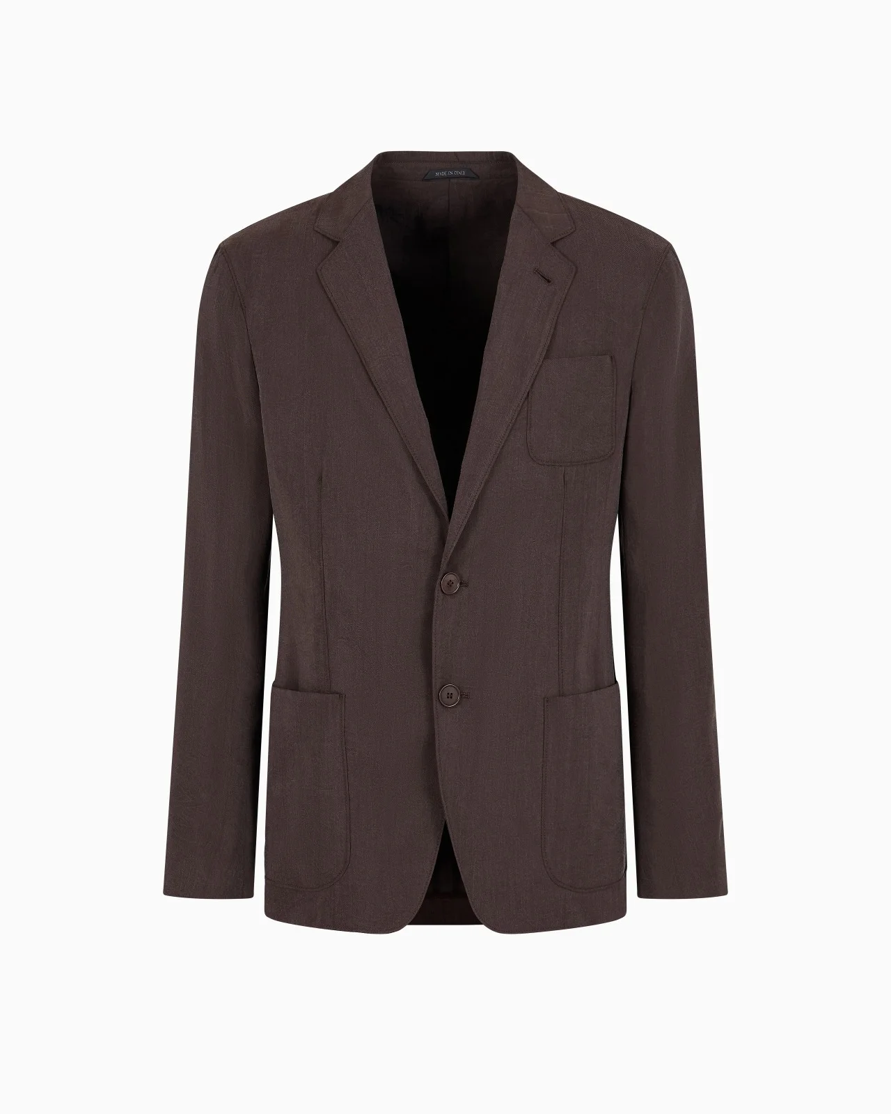 Single-breasted jacket from the Upton line with a streamlined, completely deconstructed fit: a characteristic that gives the style the iconic fluid lines that are so representative of Giorgio Armani style. This two-button style is made from a washed silk blend and features notched lapels, patch pockets and a breast pocket. Product Code: GM000140TE100811U6031 Details Composition 79% Mulberry silk 21% Polyamide Upton line jacket Notched lapels Two-buttoned, single-breasted closure Two patch pockets Breast patch pocket Button cuffs Unlined Two small internal buttoned pockets Length: 73 cm Made in Italy Fitting The model is 188 cm tall and is wearing size 48 / M