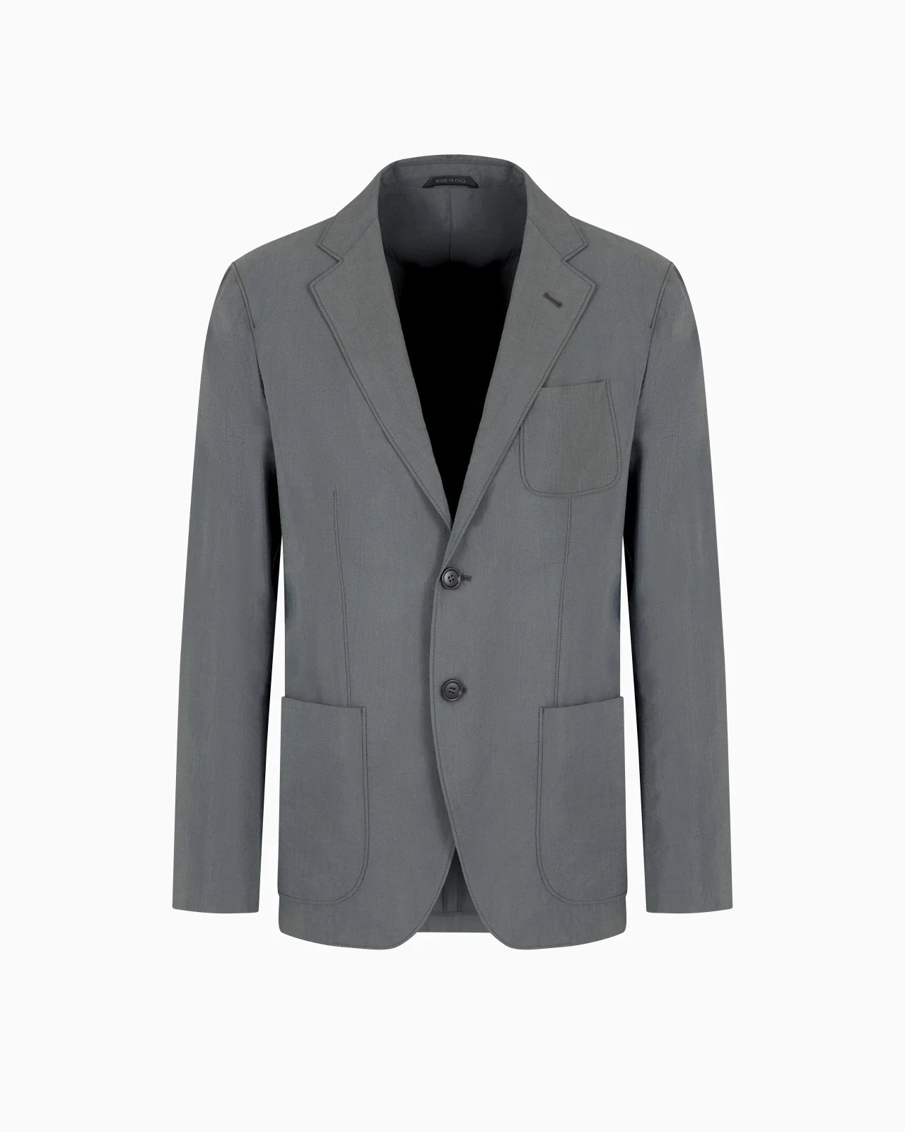 Single-breasted jacket from the Upton Line with a streamlined, completely deconstructed fit: a characteristic that gives the style the iconic fluid lines that are so representative of Giorgio Armani style. This two-button style is made from washed silk in a distinctive cannete weave and features notched lapels, patch pockets and a breast pocket. Upton Line jacket Notched lapels Two-buttoned, single-breasted closure Two patch pockets Breast patch pocket Button cuffs Two small internal buttoned pockets Unlined Length: 73 cm Made in Italy Product Code: GM000140TE10081U8167
