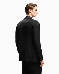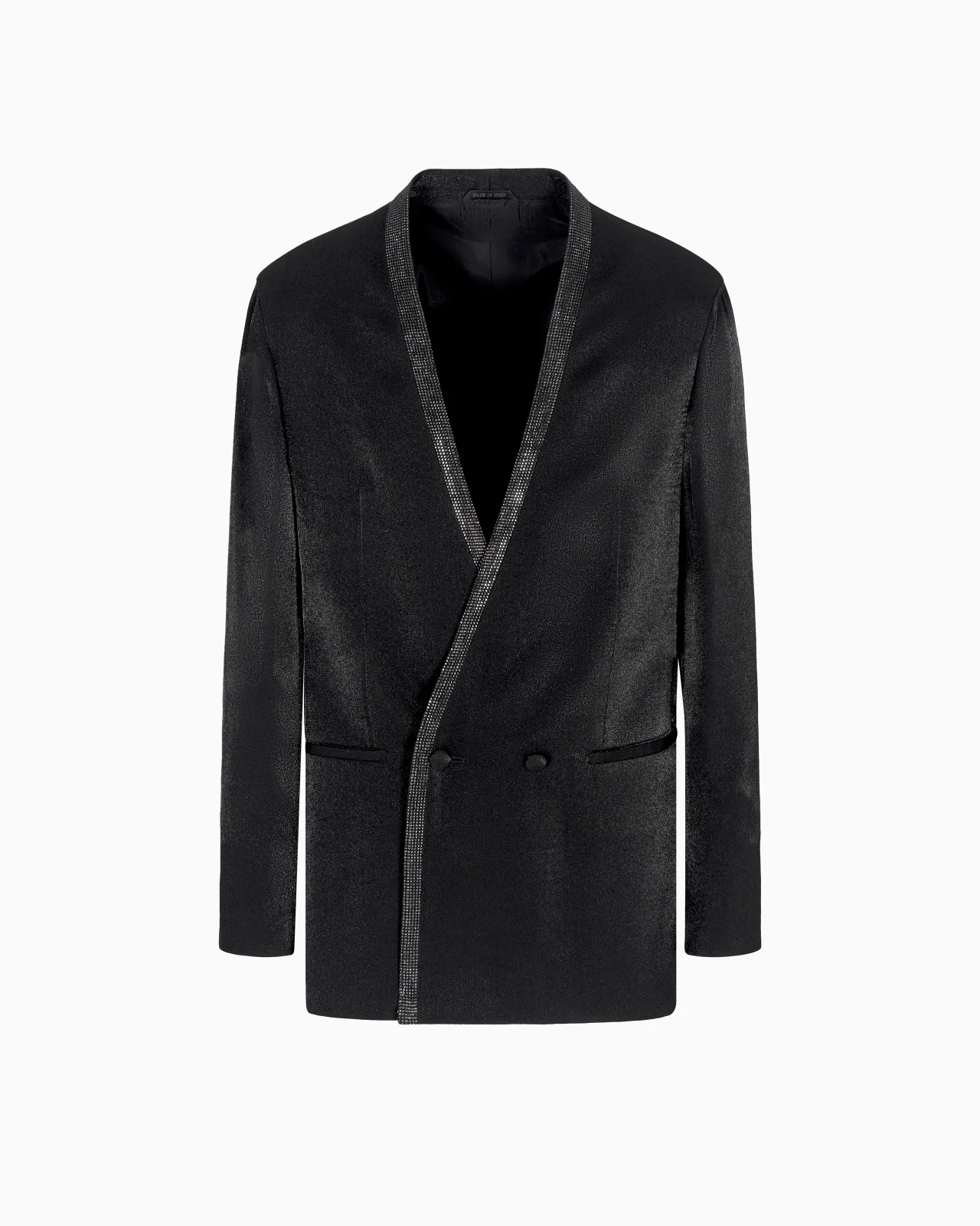 The ultimate symbol of elegance, the tuxedo jacket is a must-have of the refined male wardrobe. This double-breasted two-button style from the Upton line is made from a viscose blend with a shiny feel and is embellished with a monochromatic rhinestone insert that illuminates the neckline. The piece is part of the exclusive collection that celebrates the connection between Giorgio Armani and the world of Hollywood. A colour palette of deep blues combines with a profound and ever-elegant black, to create a sparkling, luxurious selection inspired by the limelight and most exclusive Hollywood parties. Extremely sophisticated pieces with iconic lines are made of velvets, silks and satins enlivened by crystal and rhinestone embellishments and refined workmanship. Looks for him and her, designed for evenings and special occasions. Upton Line tuxedo jacket V neck Matching rhinestone-covered insert Double-breasted closure with two covered buttons Two front welt pockets Buttons at the cuff Lined Length: 75 cm Made in Italy Product Code: GM001729TE15960MC023