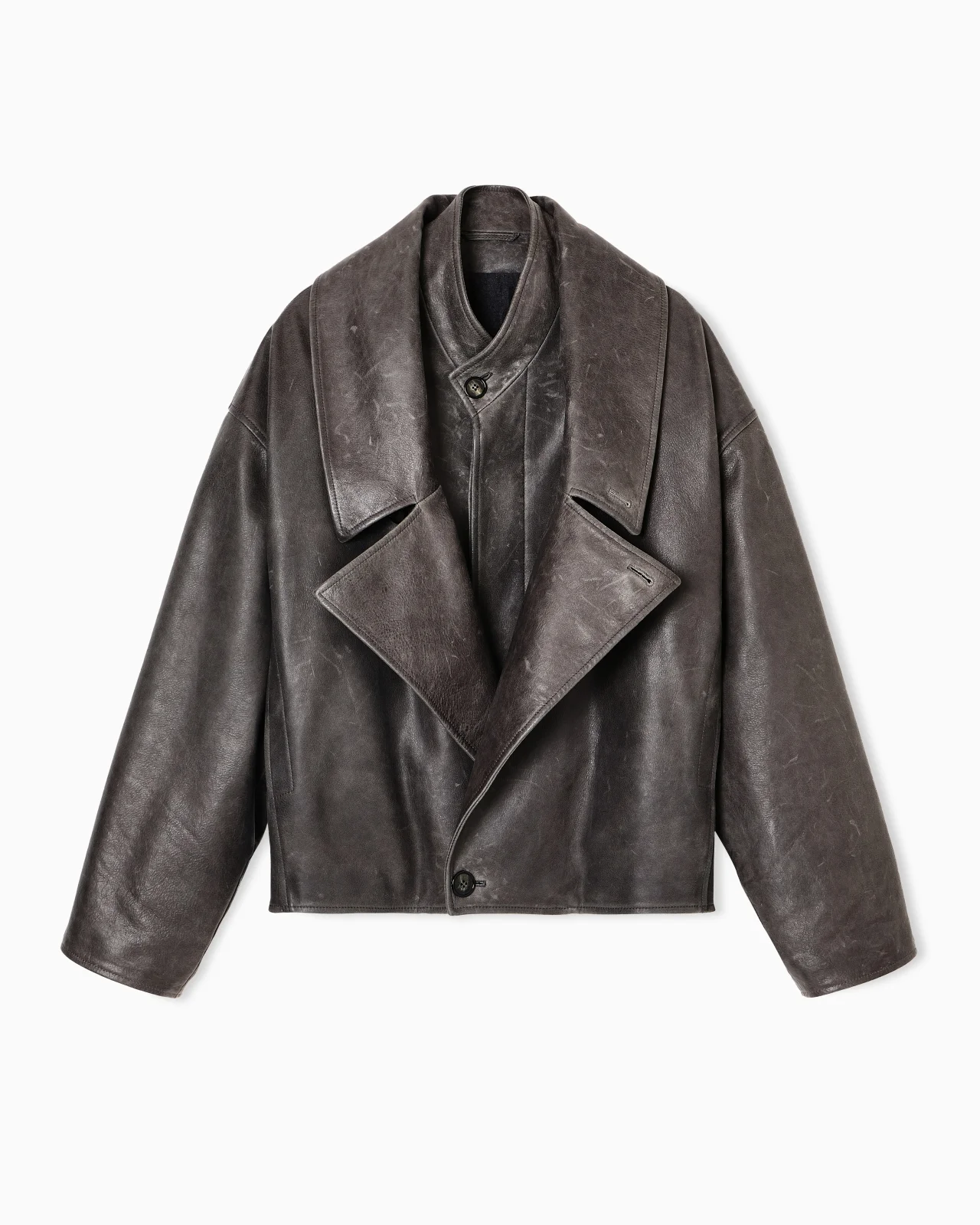 Heritage-inspired piece, featuring oversized volumes and a vintage effect accentuated by the leather, a luxurious thickened and tumbled nappa calfskin. The style is distinguished by the distinctive double fastening and double collar construction, recalling the lapel effect of formal jackets, and by the two zips along the sides, a detail that is both functional and stylistic that creates a sophisticated play of volumes. A perfect interpretation of the brand’s relaxed yet refined style, ideal for completing seasonal looks with an unmistakable touch. Oversized fit Thickened and tumbled calfskin for a decidedly vintage effect Buttoned stand collar Double fastening creating a lapel effect Concealed internal button closure External button closure Low-set sleeves Side zip detail with leather pull tab Two side pockets with press studs Wool lining Satin sleeve lining Two small internal buttoned pockets Nappa-leather inside pocket with embossed GA logo Length: 63 cm Made in Italy Product Code: GM002241AF20394UB104