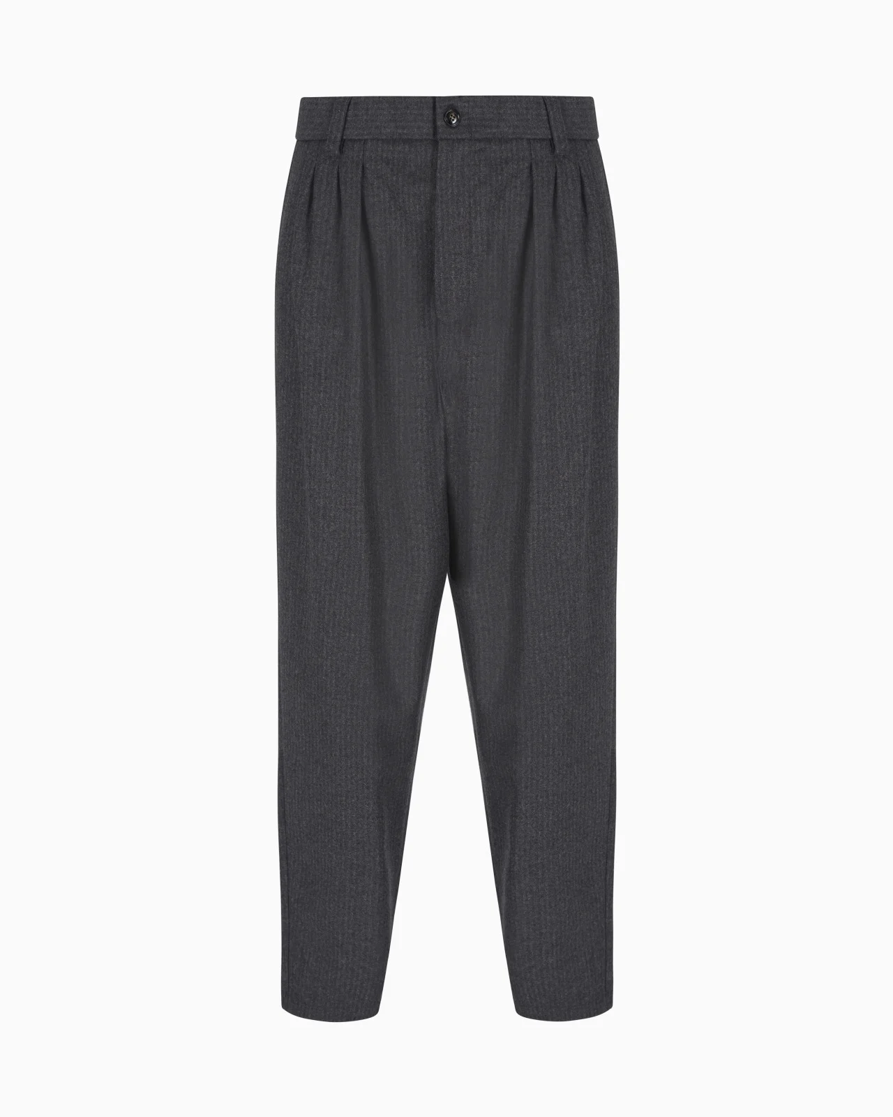 Comfortable two-dart trousers made of virgin wool and cashmere, with a monochromatic pinstriped motif that adds movement. They feature an elasticated waistband with a zip and button closure, side inseam pockets and double-welt back pockets. A flowing, versatile piece distinguished by its deconstructed style, the hallmark of the Giorgio Armani look. Double-darted trousers Elasticated waistband with belt loops Button and zip closure Two side welt pockets Two back double welt pockets Made in Italy Product Code: GM001122TE15454U8111